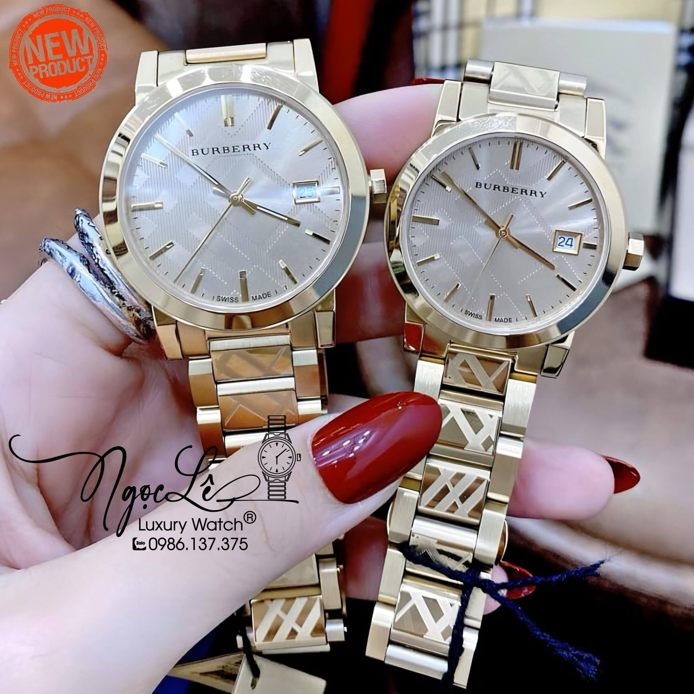 Đồng Hồ Cặp Burberry The City Vàng Gold Máy Thụy Sĩ Nam BU9038 38mm Nữ BU9145 34mm