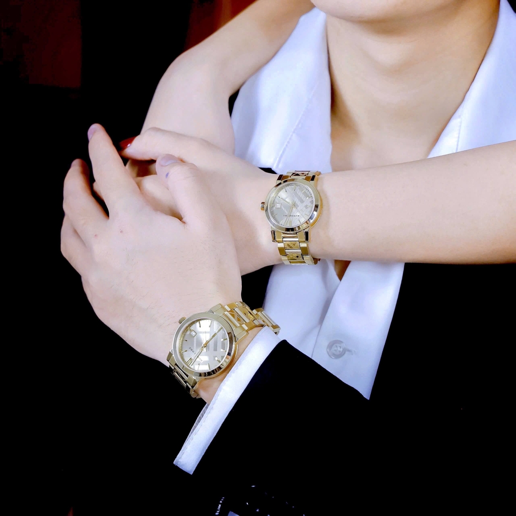 Hình ảnh Đồng Hồ Cặp Burberry The City Dây Kim Loại Vàng Gold Size 34mm 38mm BU9038 BU9145
