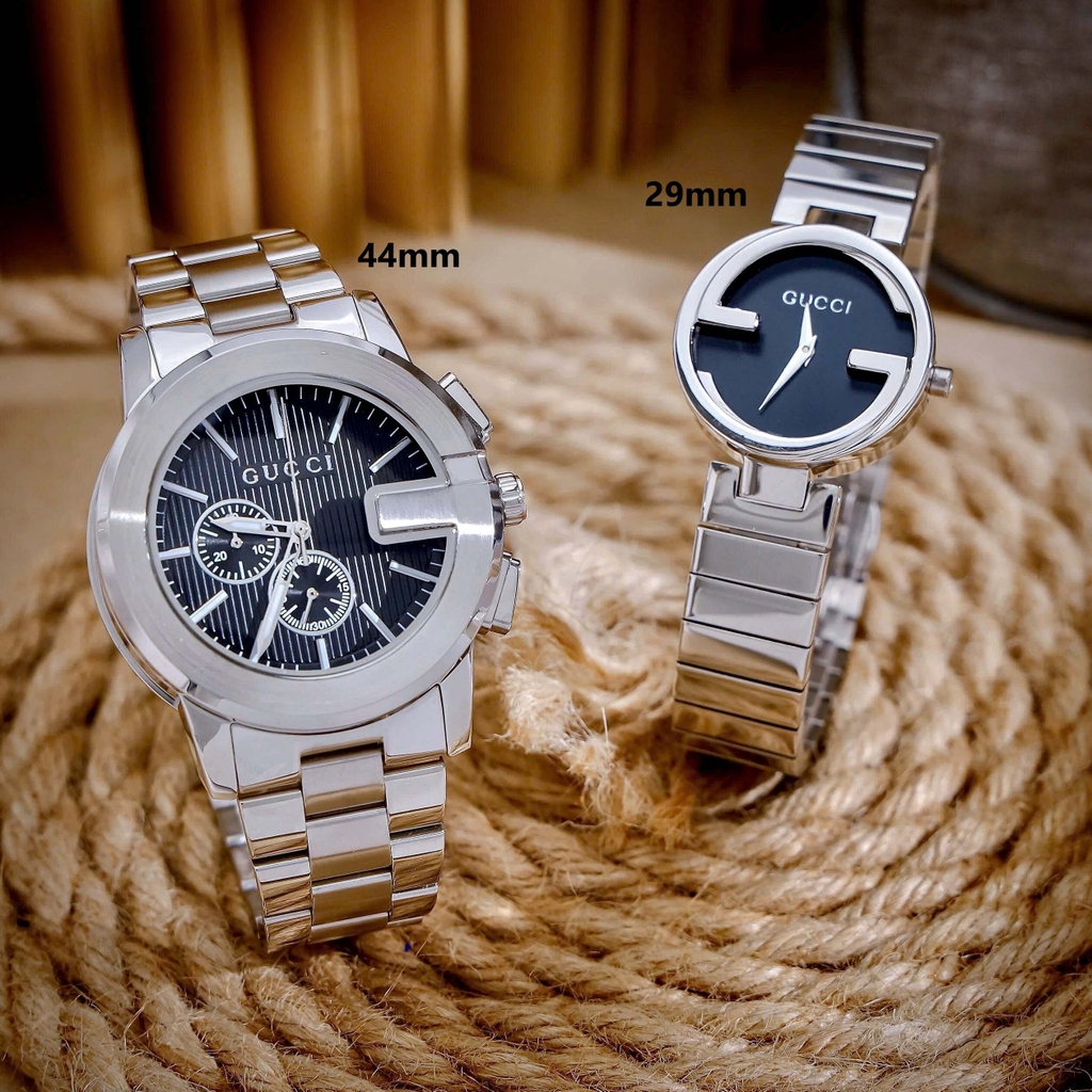 Đồng Hồ Cặp Gucci Dây Kim Loại Bạc Mặt Đen Cao Cấp Nam 44mm Nữ 29mm