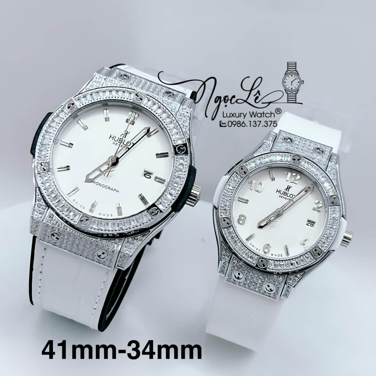 Đồng Hồ Cặp Hublot Classic Fusion Dây Silicon Trắng Đính Đá Vỏ Màu Bạc Size 41mm - 34mm