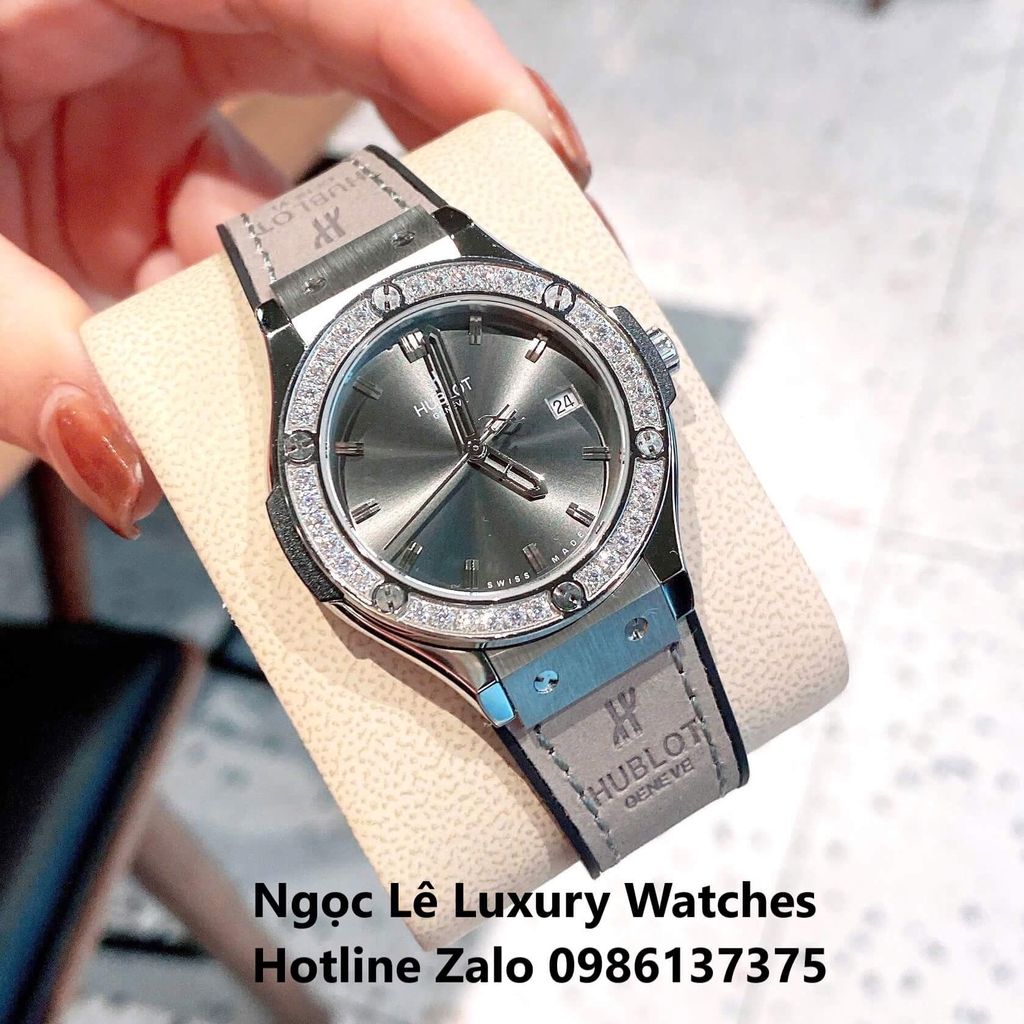 Đồng hồ Hublot cặp màu xám đính đá, Hublot máy pin màu xám