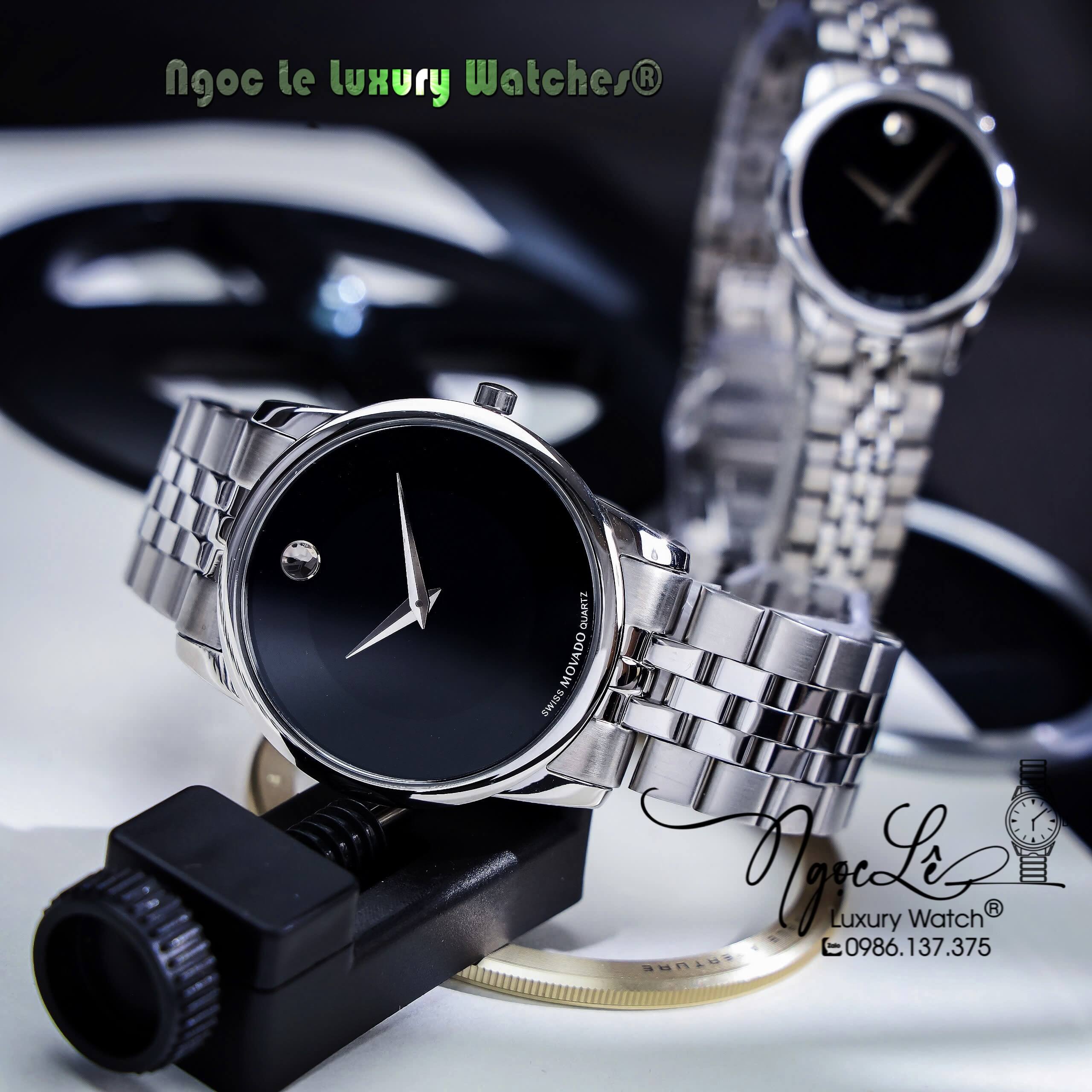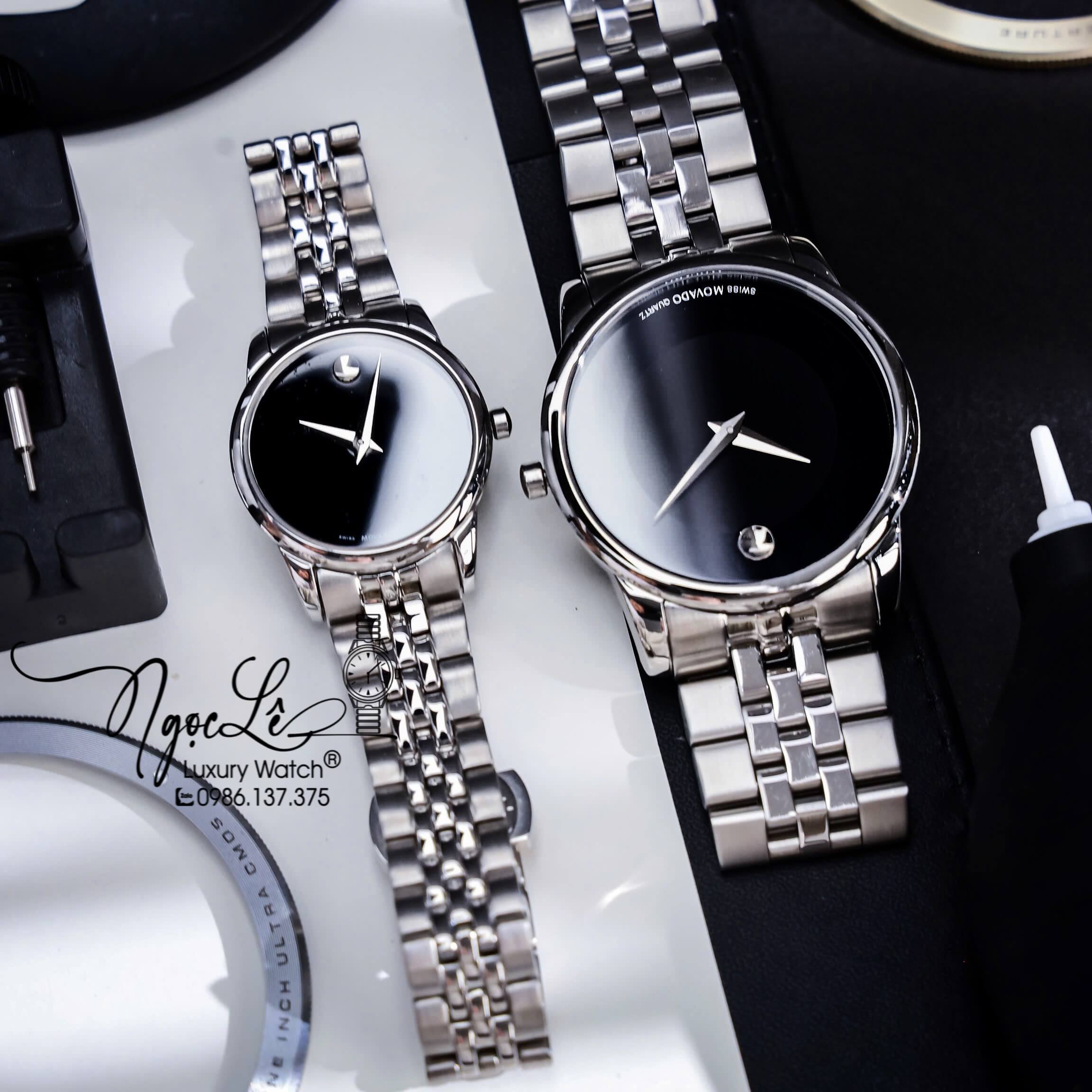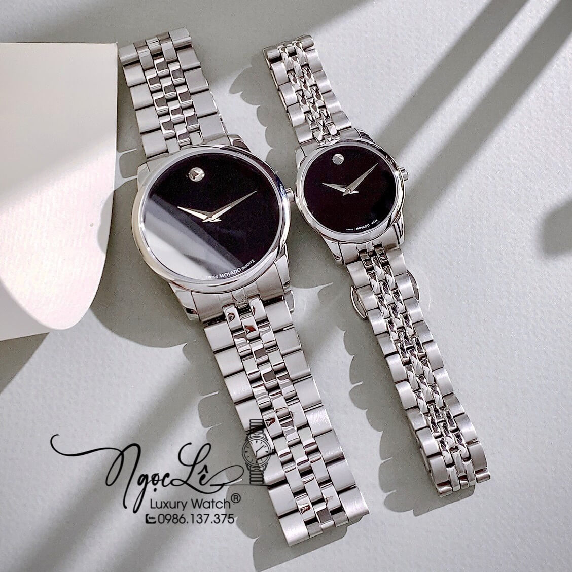 - Đồng Hồ Cặp Movado Museum Cao Cấp Dây Kim Loại Bạc Mặt Đen 40mm - 28mm