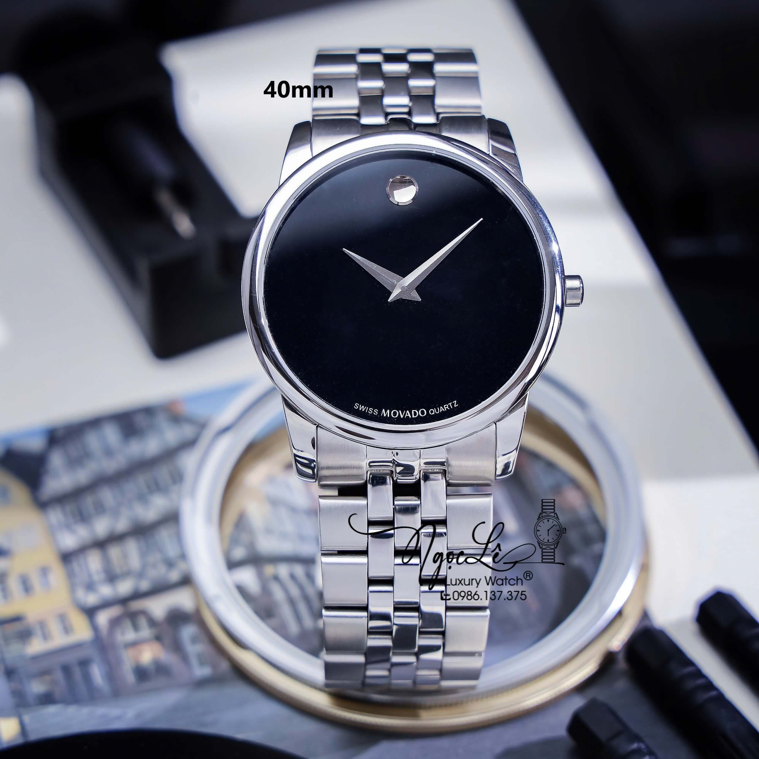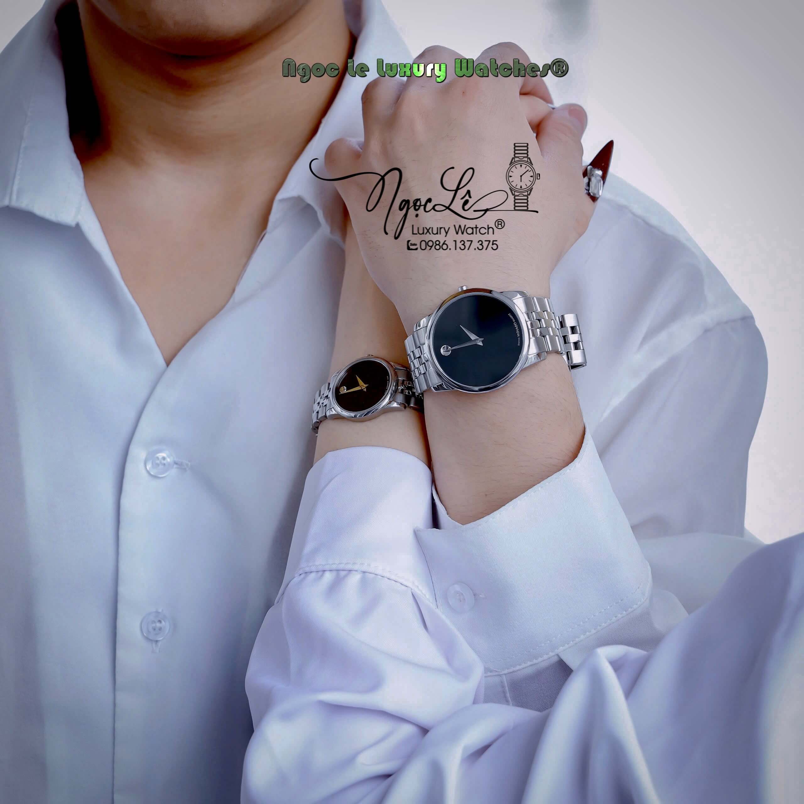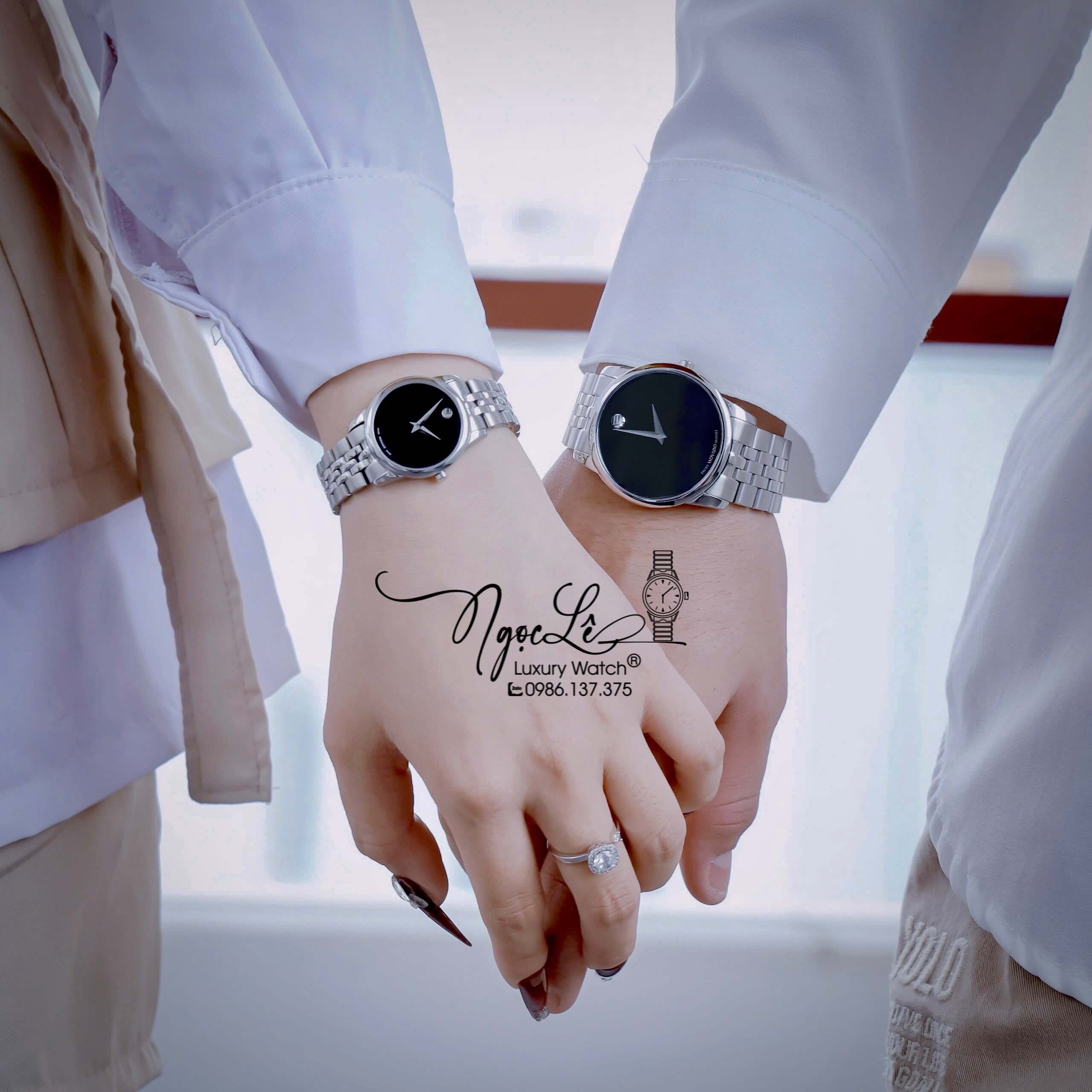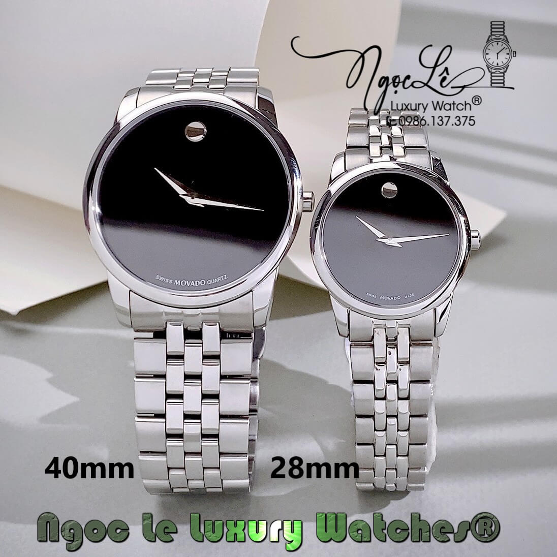 - Đồng Hồ Cặp Movado Museum Cao Cấp Dây Kim Loại Bạc Mặt Đen 40mm - 28mm