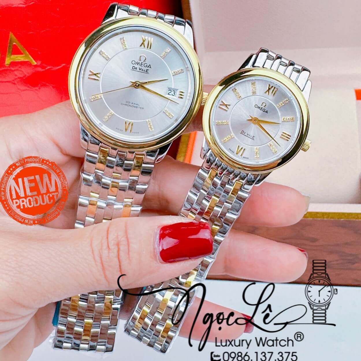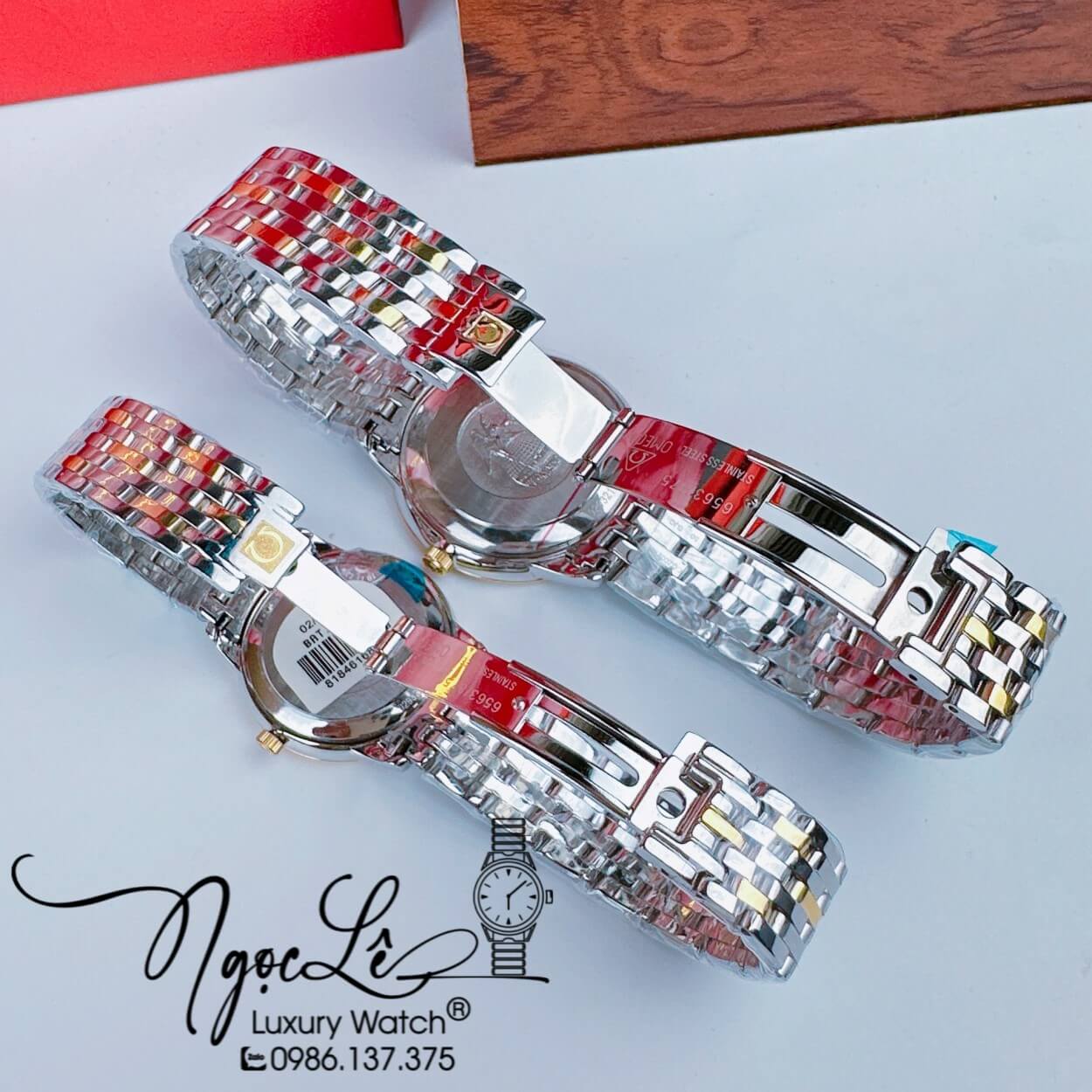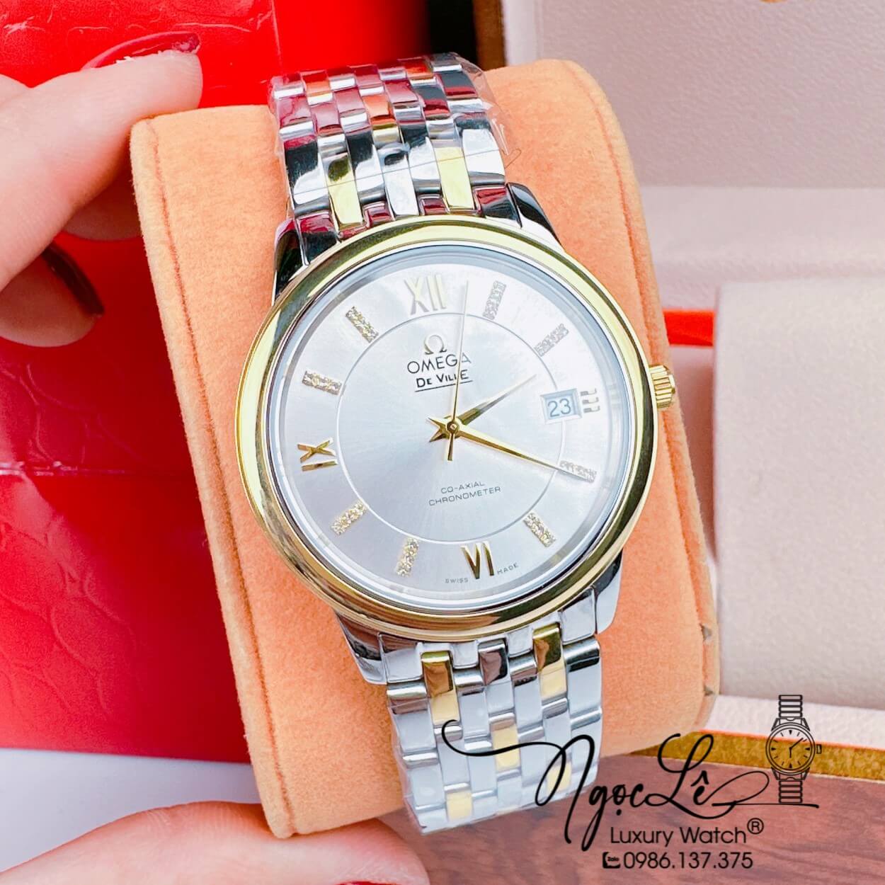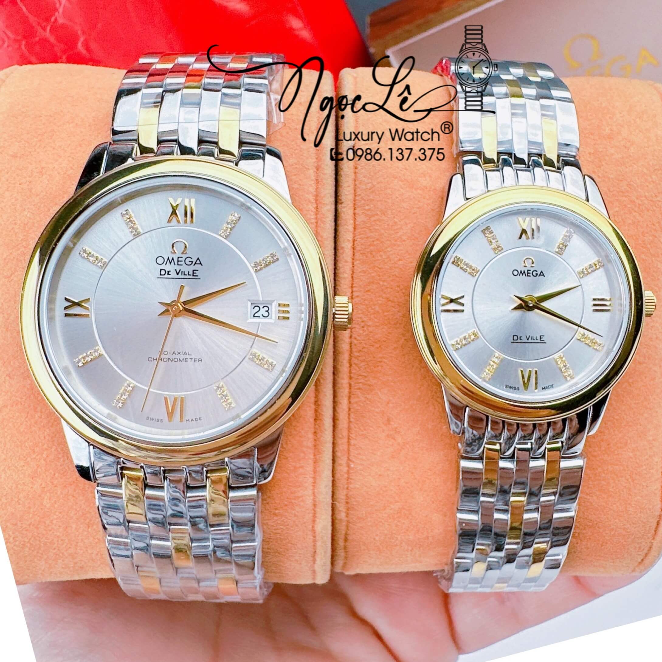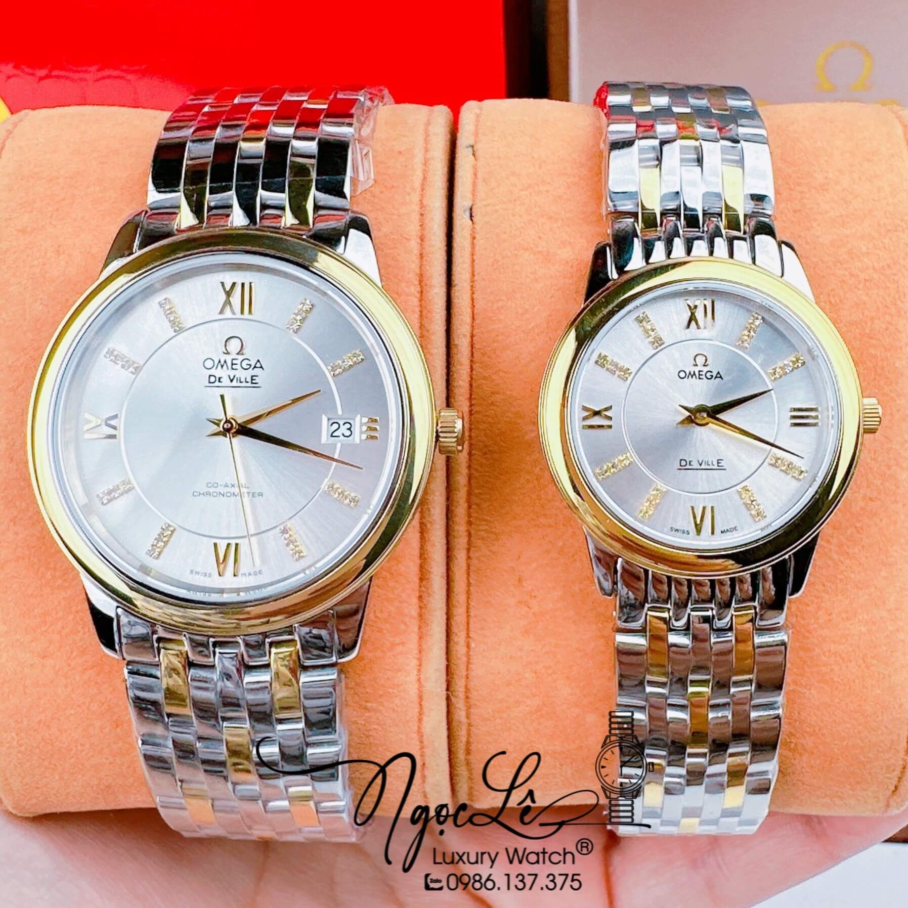 Hình Ảnh thực tế Đồng Hồ Cặp Omega Deville Máy Pin Thụy Sỹ Dây Kim Loại Demi Mặt Trắng 39mm-30mm