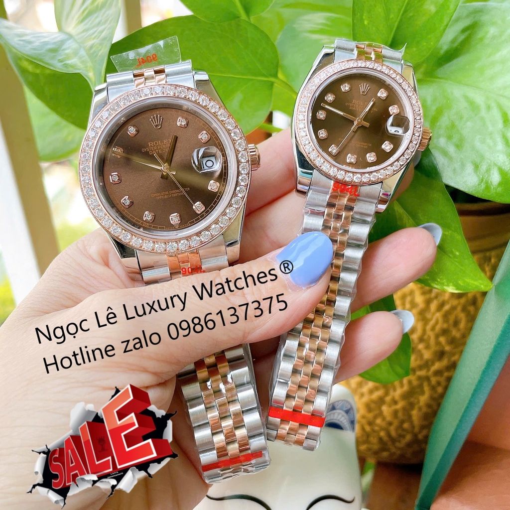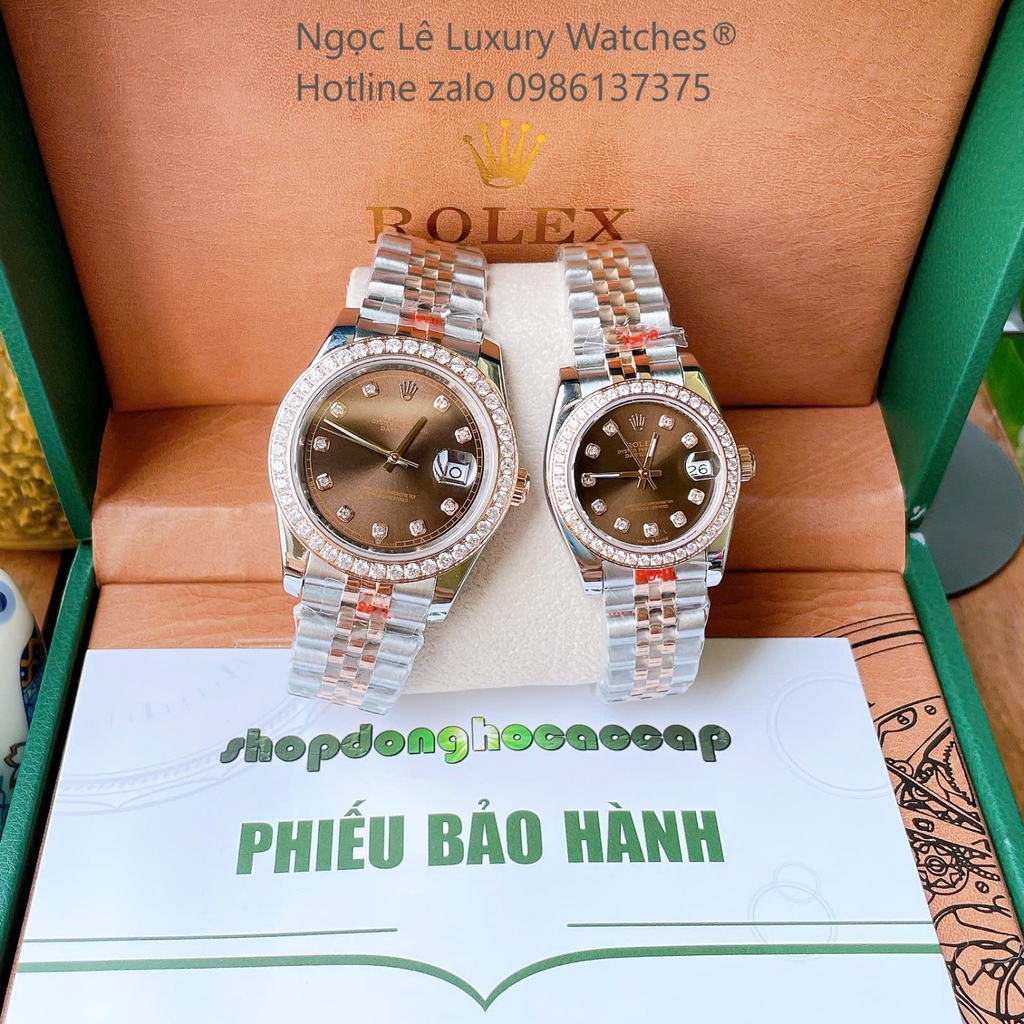 Đồng Hồ Cặp Rolex Datejust Cơ Tự Động Dây Demi Rose Mặt Nâu 41mm – 31mm Viền Đính Đá Cao Cấp