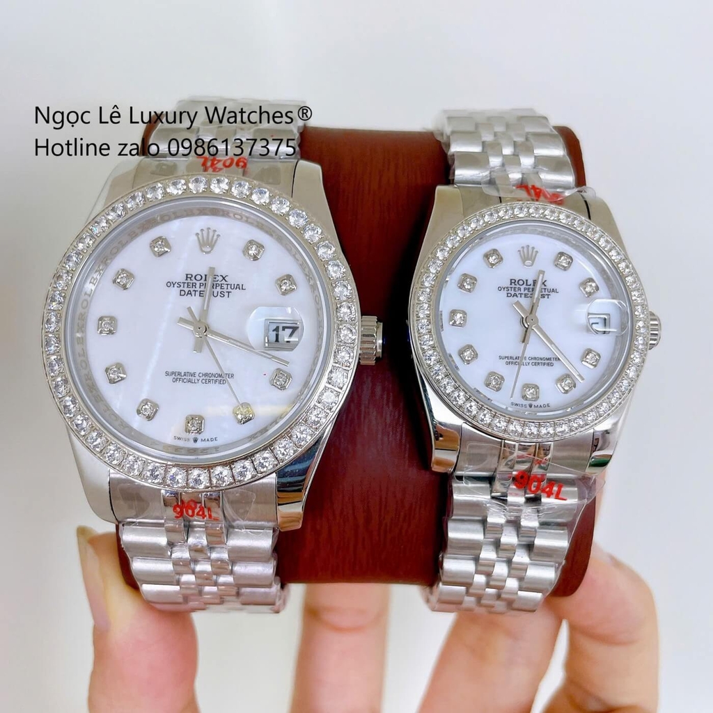 Đồng Hồ Cặp Rolex Datejust Dây Thép Silver Mặt Xà Cừ Trắng Niềng Đính Đá Size 41mm - 31mm - Quartz