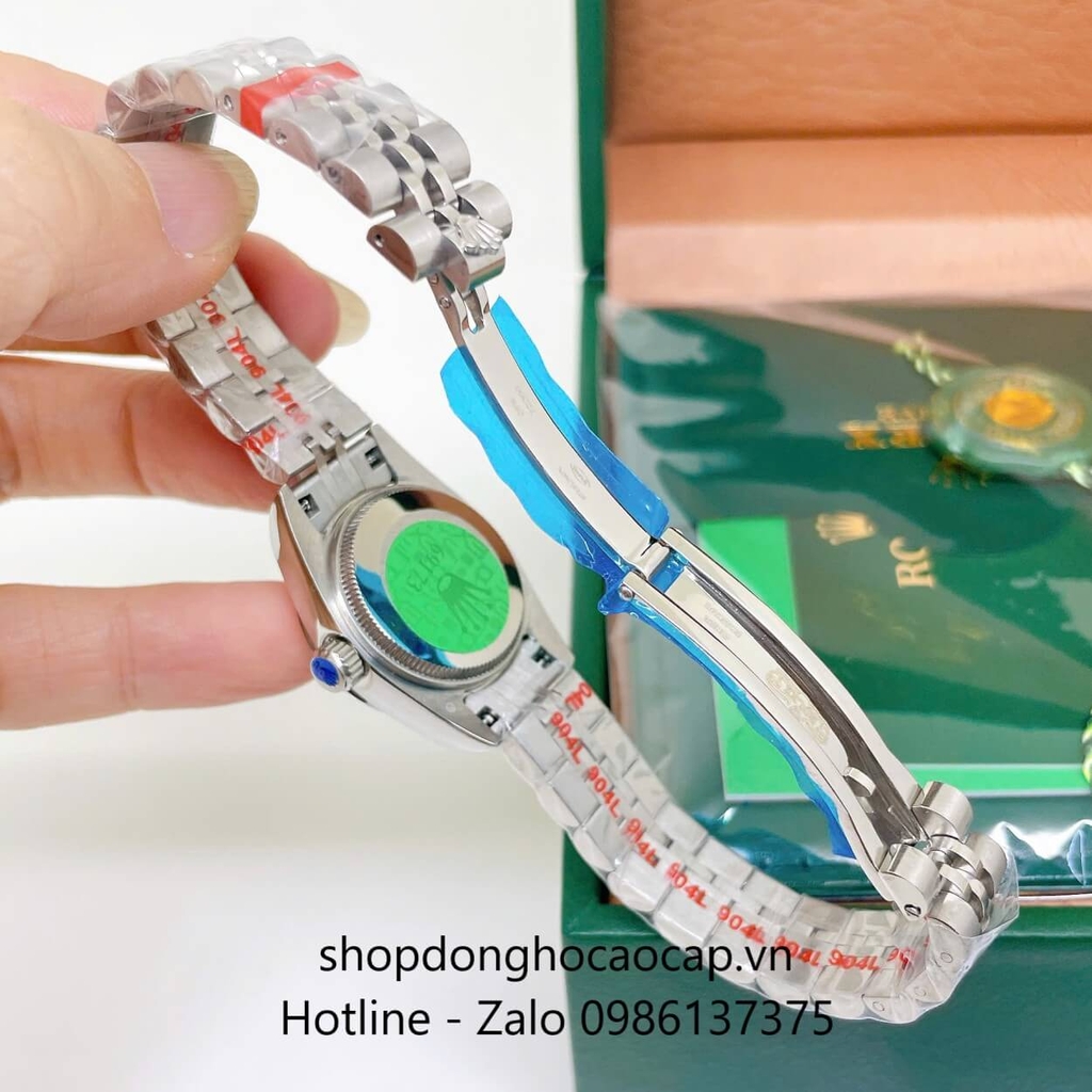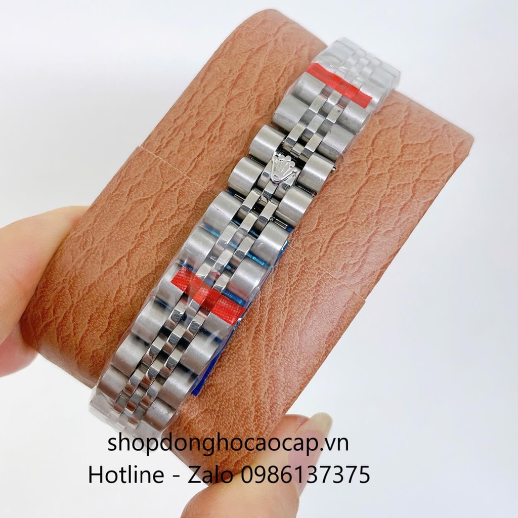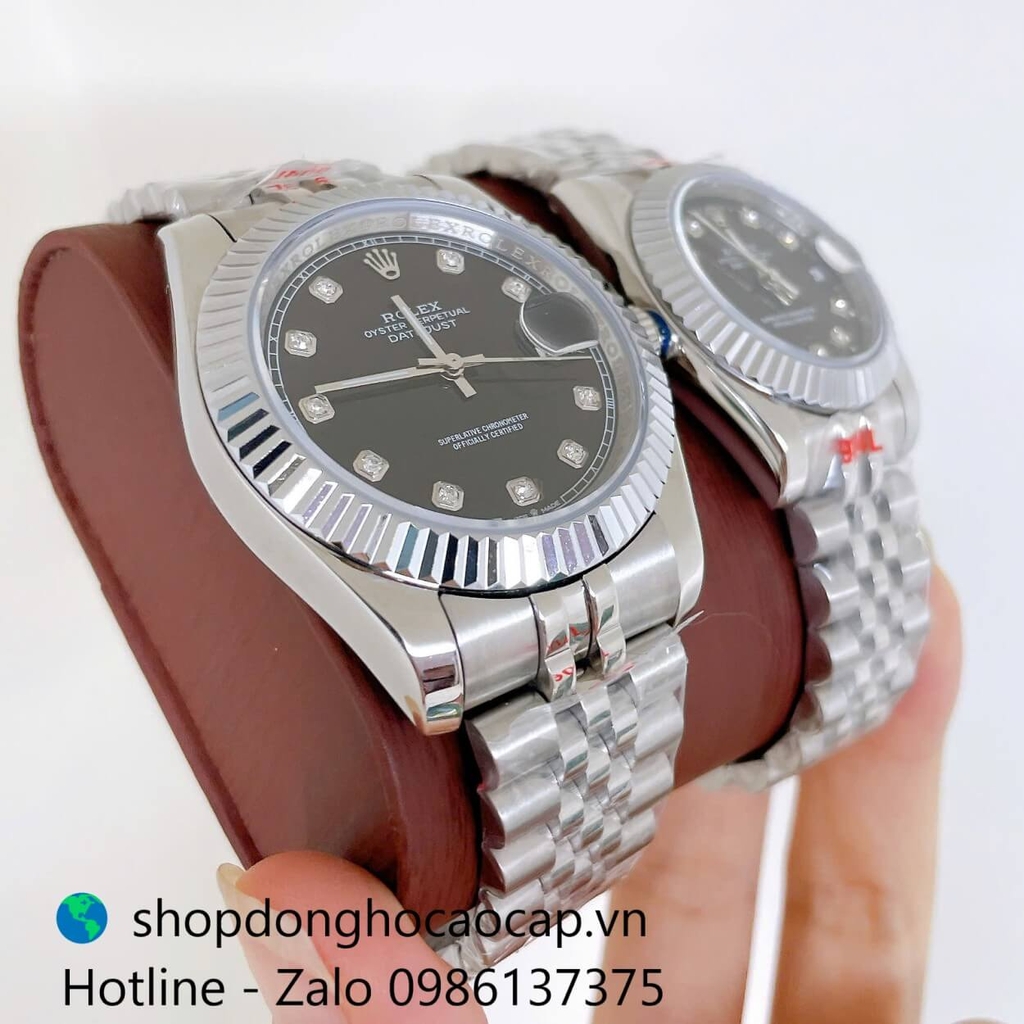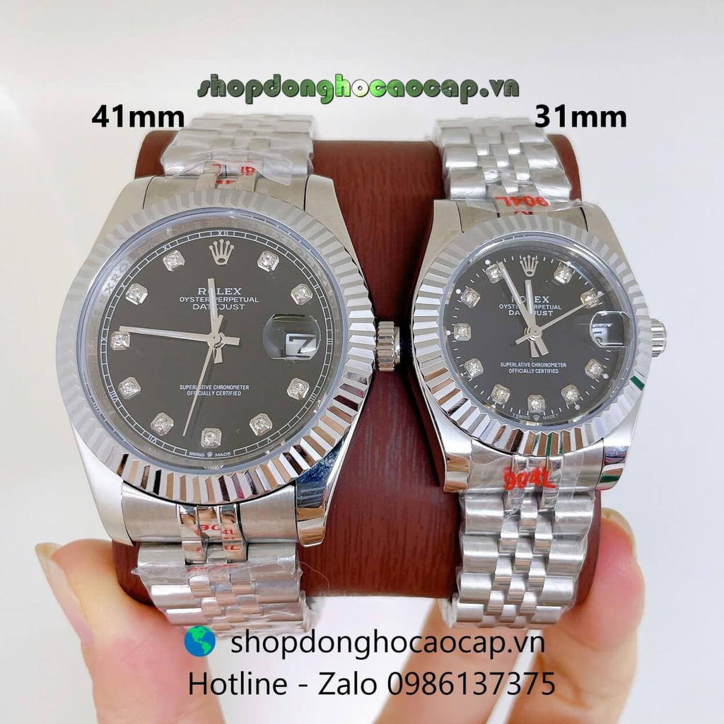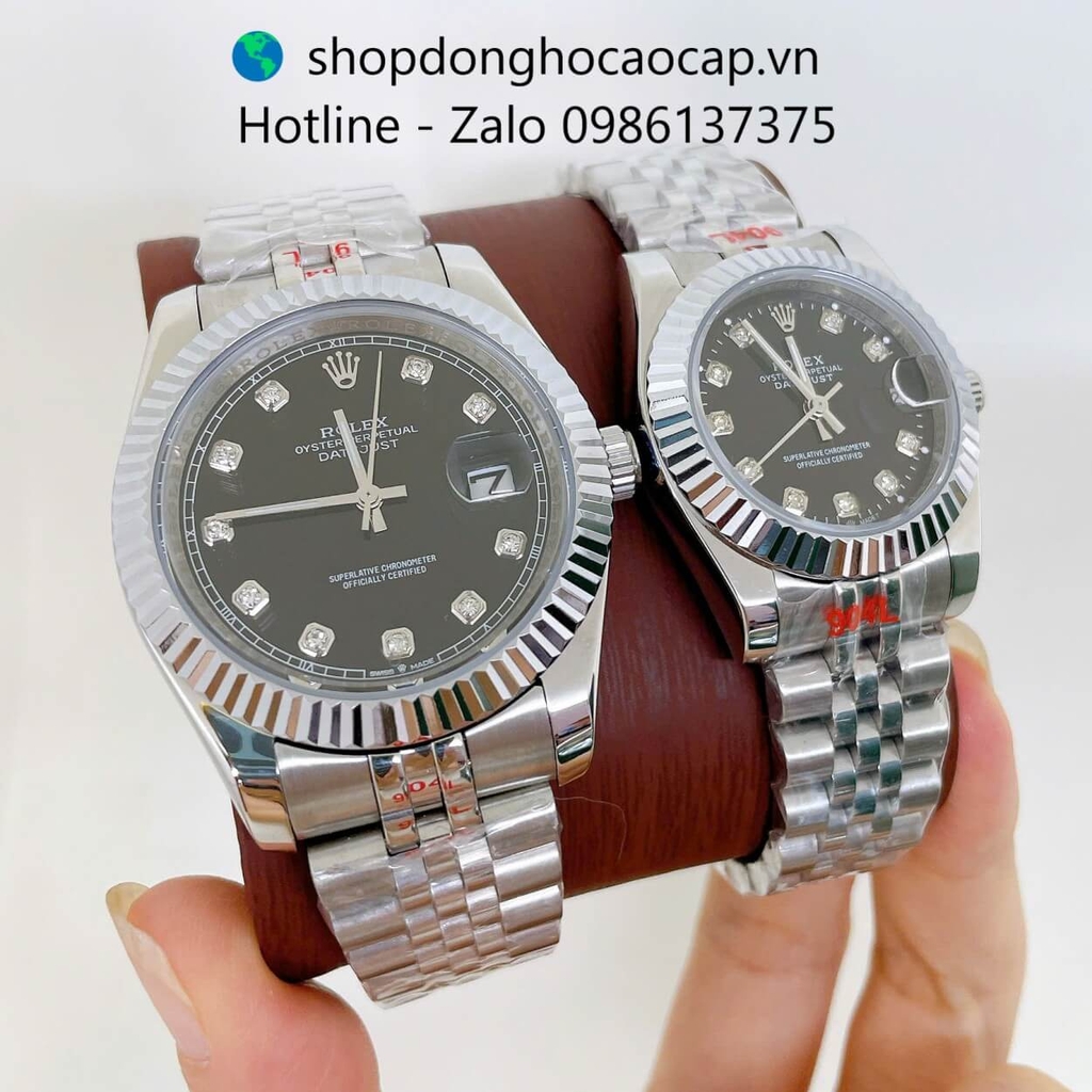 Đồng Hồ Cặp Rolex Datejust Máy Pin Dây Bạc Mặt Đen Niềng Khía Size 41mm - 31mm
