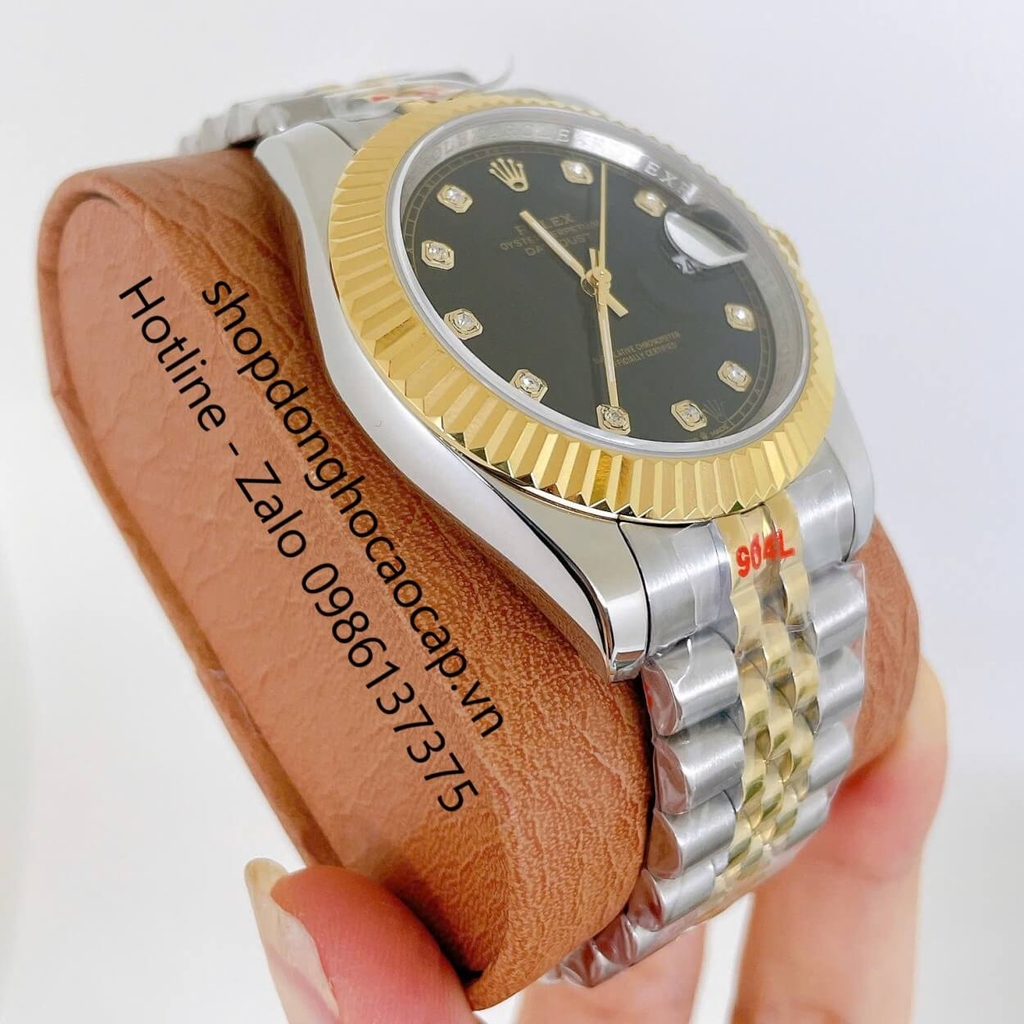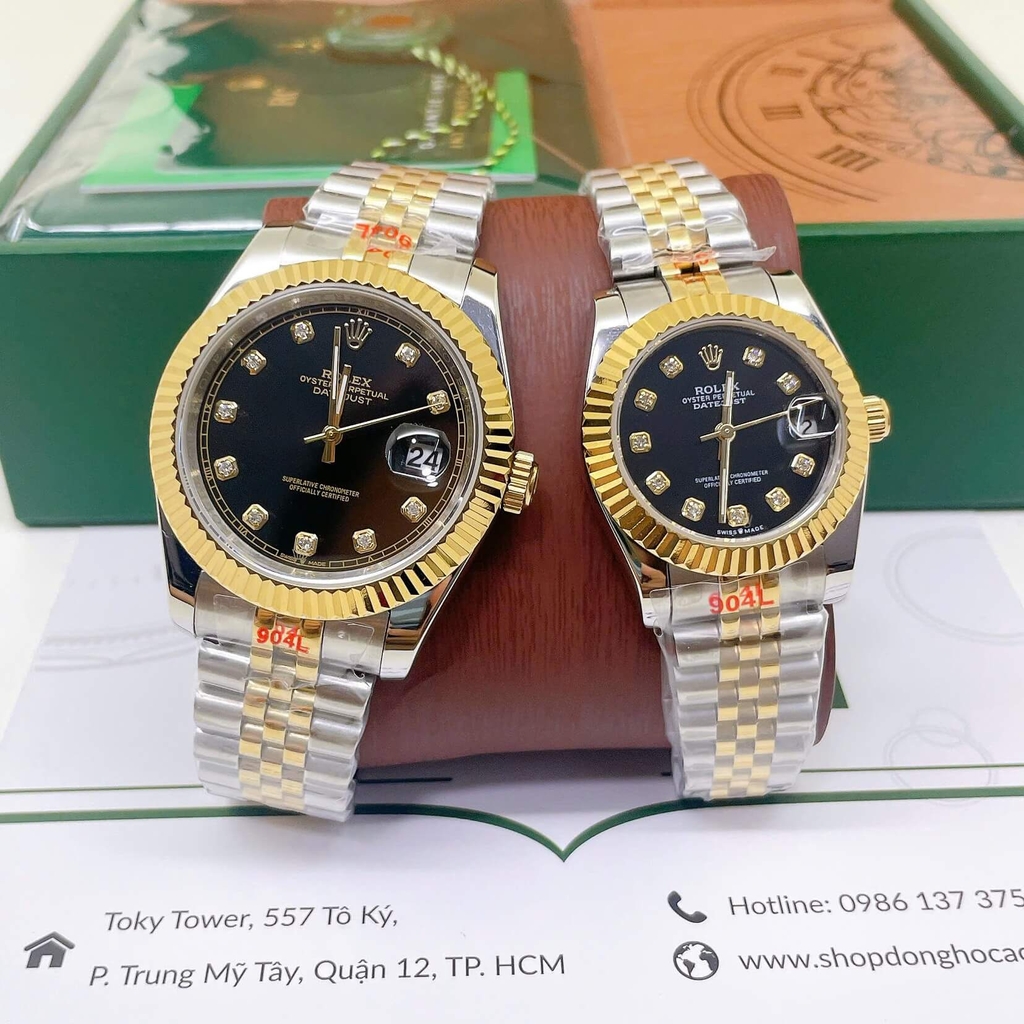 Đồng Hồ Cặp Rolex Datejust Máy Pin Dây Demi Vàng Mặt Đen Niềng Khía Size 41mm - 31mm