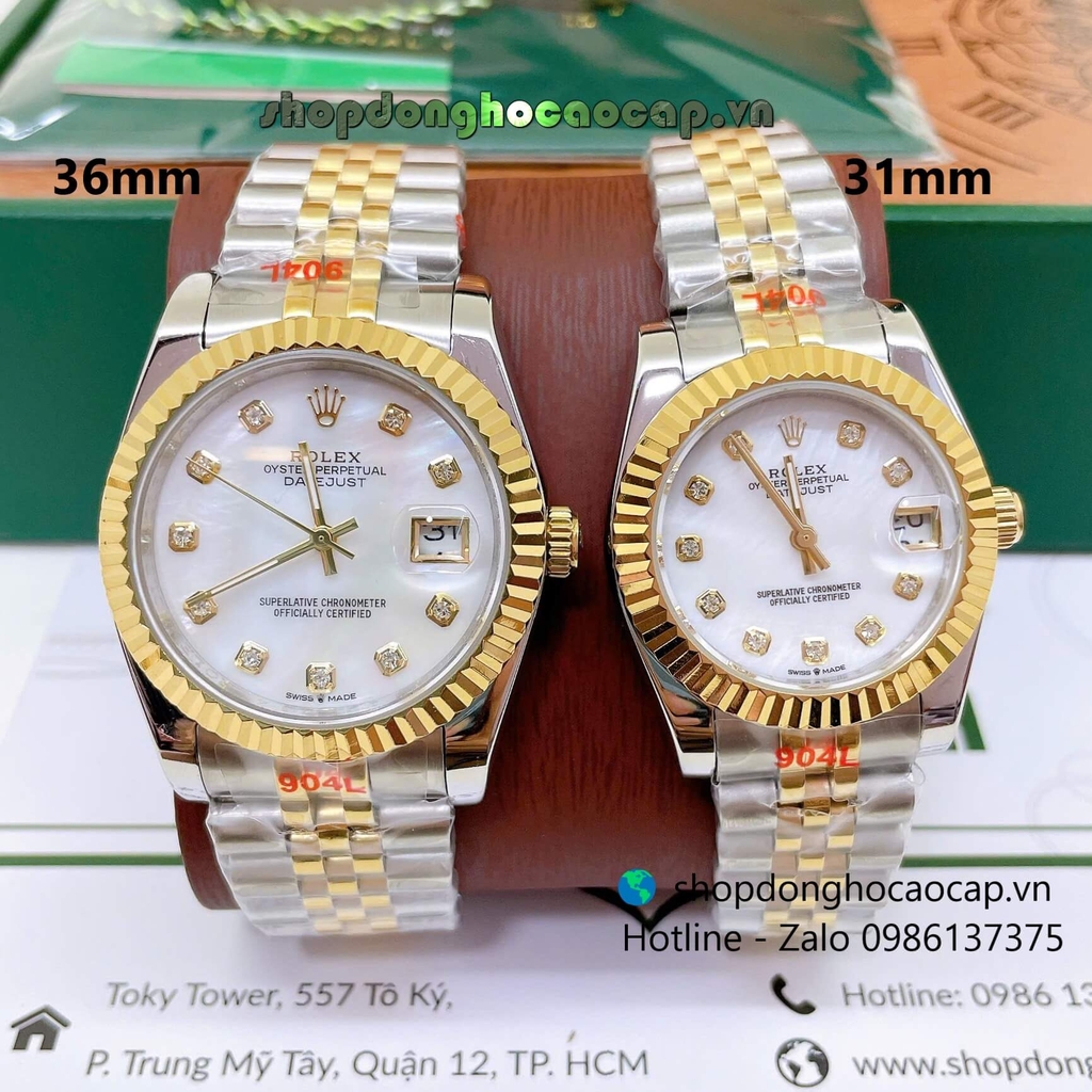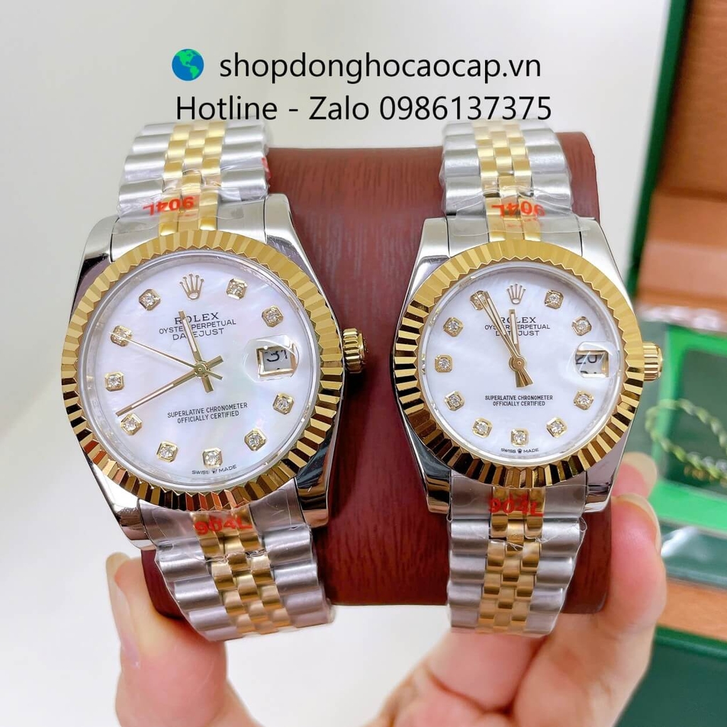 Đồng Hồ Cặp Rolex Datejust Máy Pin Dây Demi Vàng Mặt Xà Cừ Trắng Niềng Khía Size 36mm - 31mm