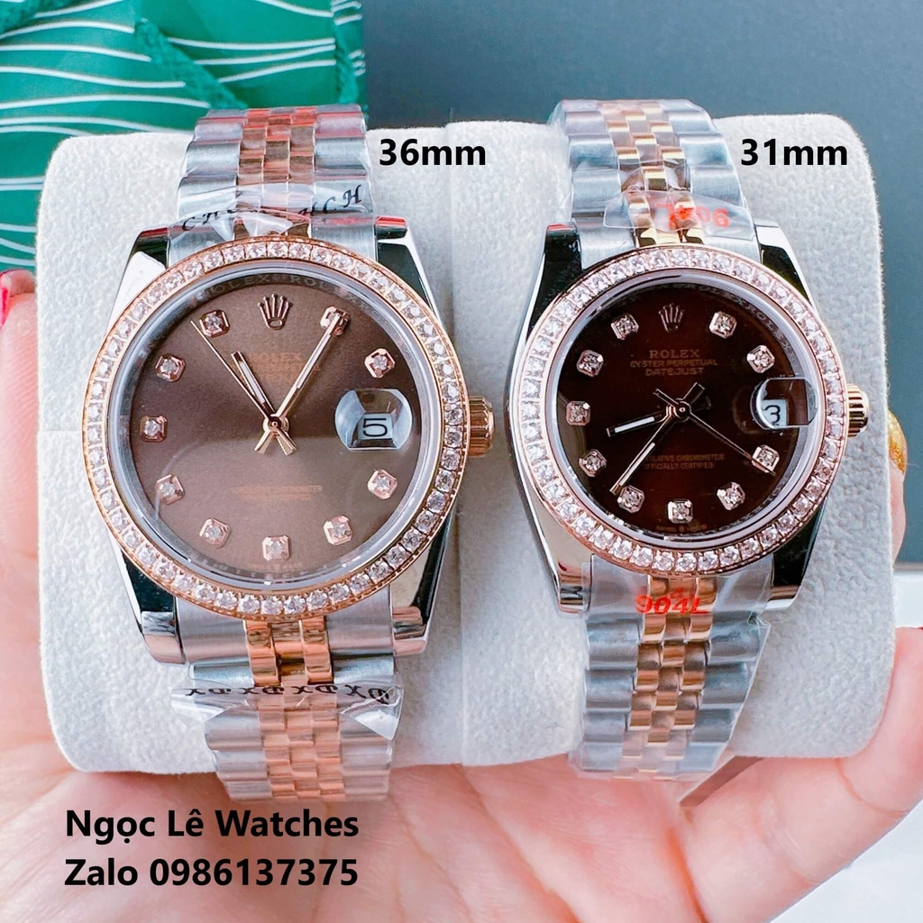 Đồng Hồ Cặp Rolex Datejust Máy Pin Demi Rose Gold Mặt Nâu Viền Đá Size 36mm - 31mm