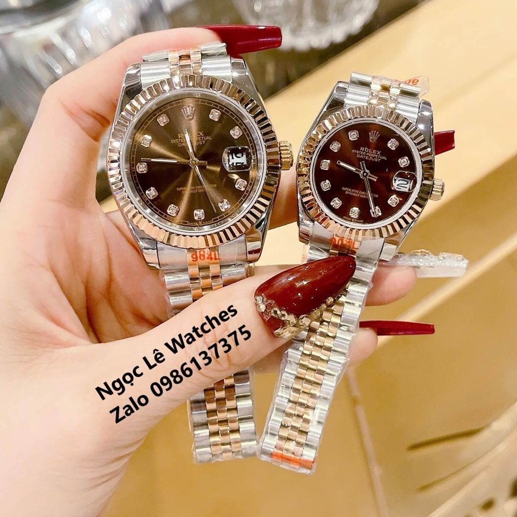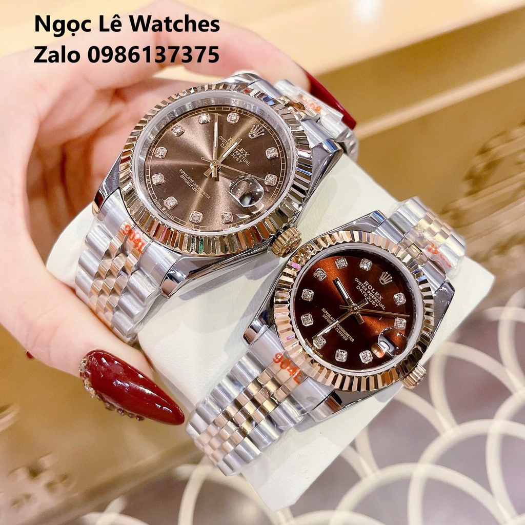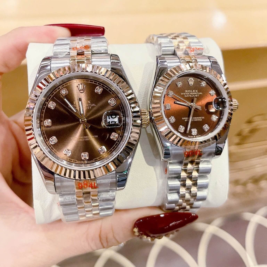 Đồng Hồ Cặp Rolex Datejust Máy Pin Demi Rose Mặt Nâu Niềng Khía Size Nam 41mm - Nữ 31mm