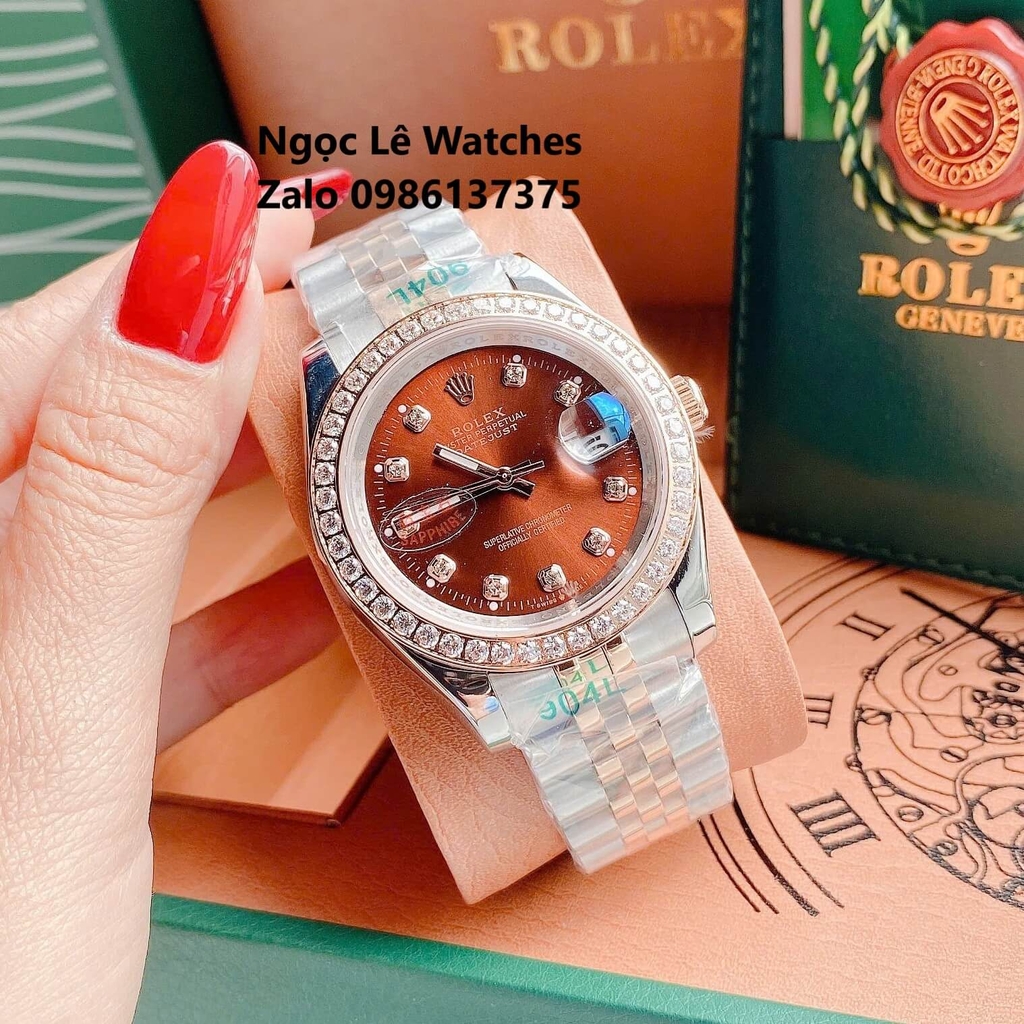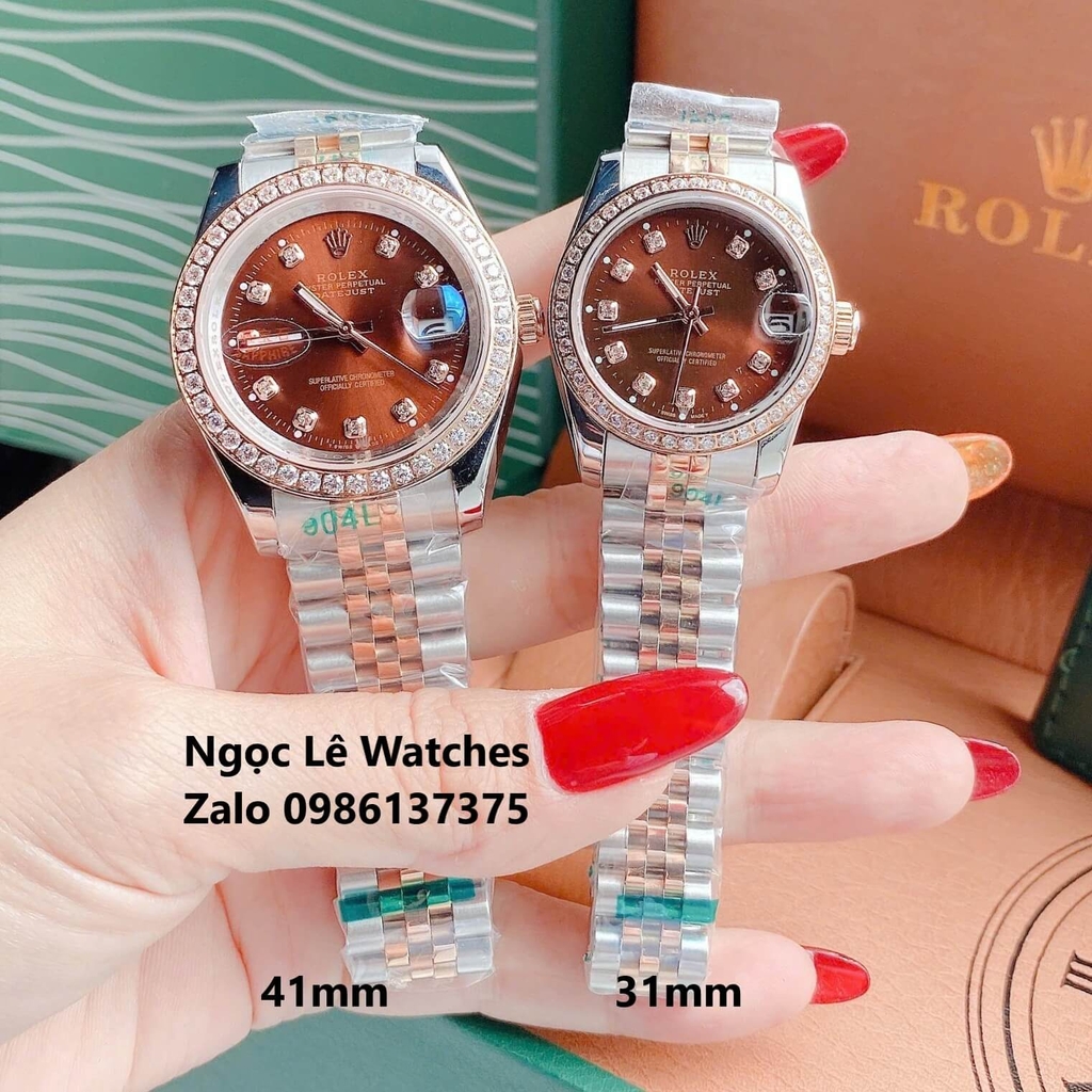 Đồng Hồ Cặp Rolex Datejust Máy Pin Demi Vàng Hồng Mặt Nâu Viền Đá Size 41mm - 31mm