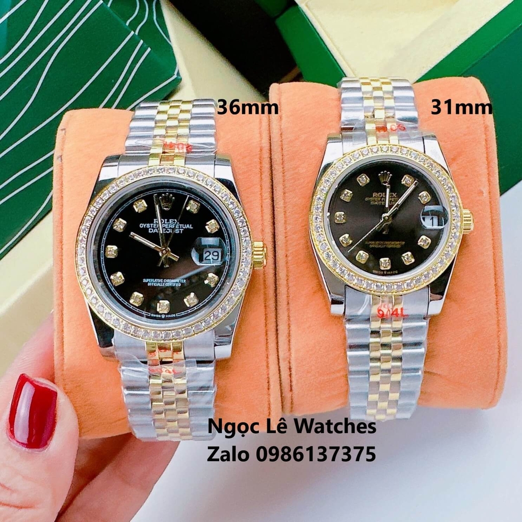 Đồng Hồ Cặp Rolex Datejust Máy Pin Demi Vàng Mặt Đen Viền Đá Size 36mm - 31mm