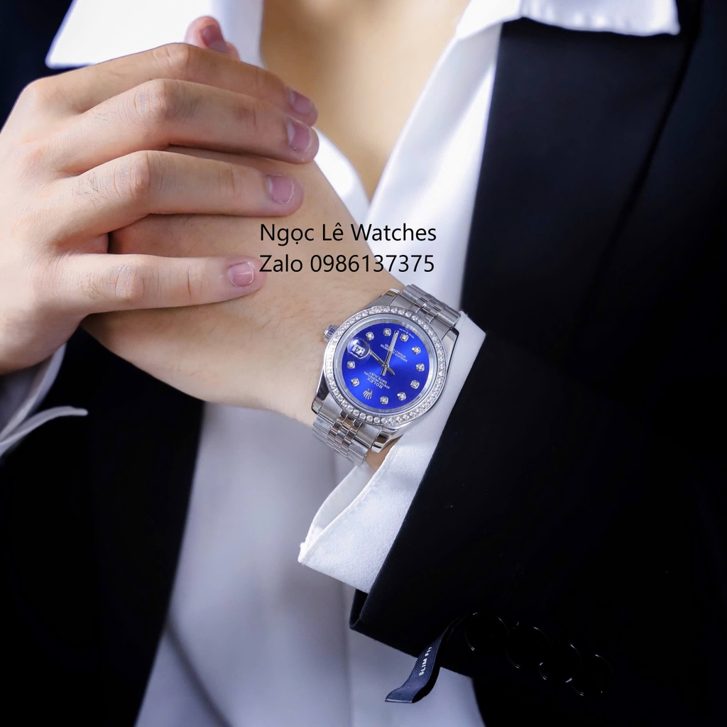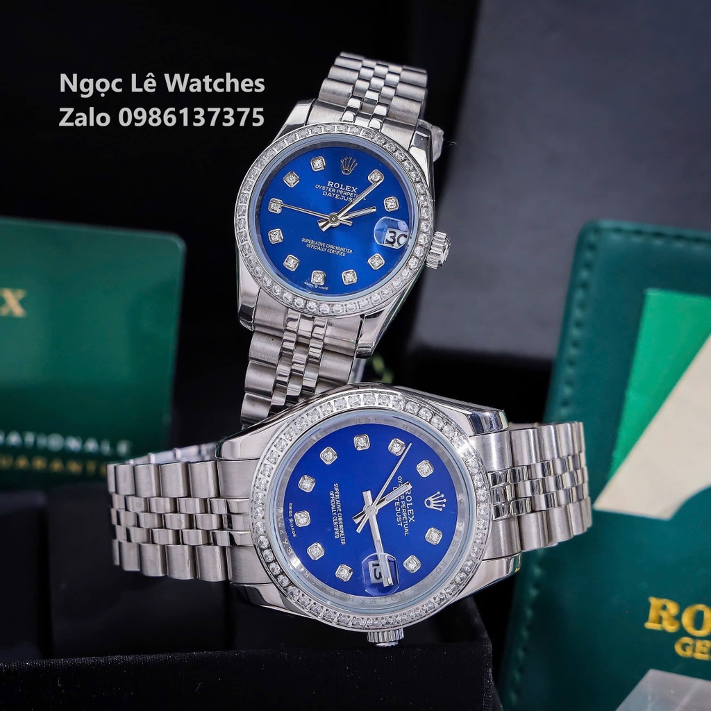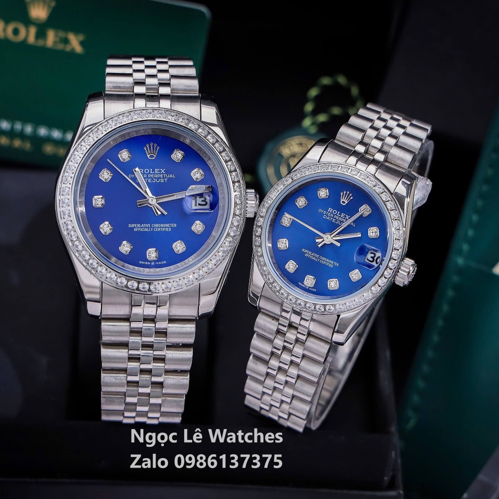 Đồng Hồ Cặp Rolex Datejust Máy Pin Màu Bạc Mặt Xanh Navy Viền Đá Size Nam 41mm Nữ 31mm