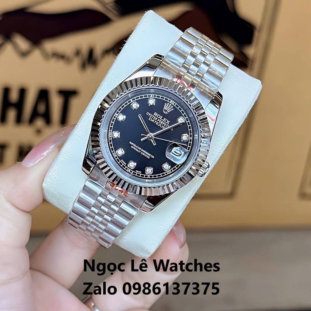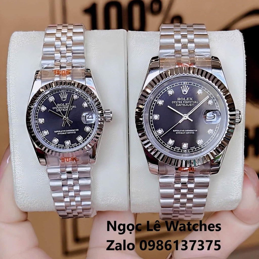 Hình ảnh Đồng Hồ Cặp Rolex Datejust Máy Pin Nam Nữ Bạc Mặt Đen Viền Khía Size 41mm - 31mm