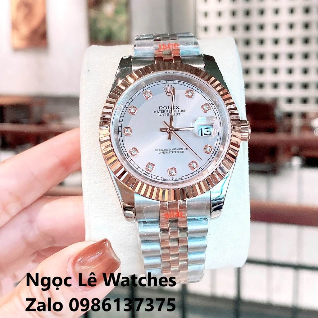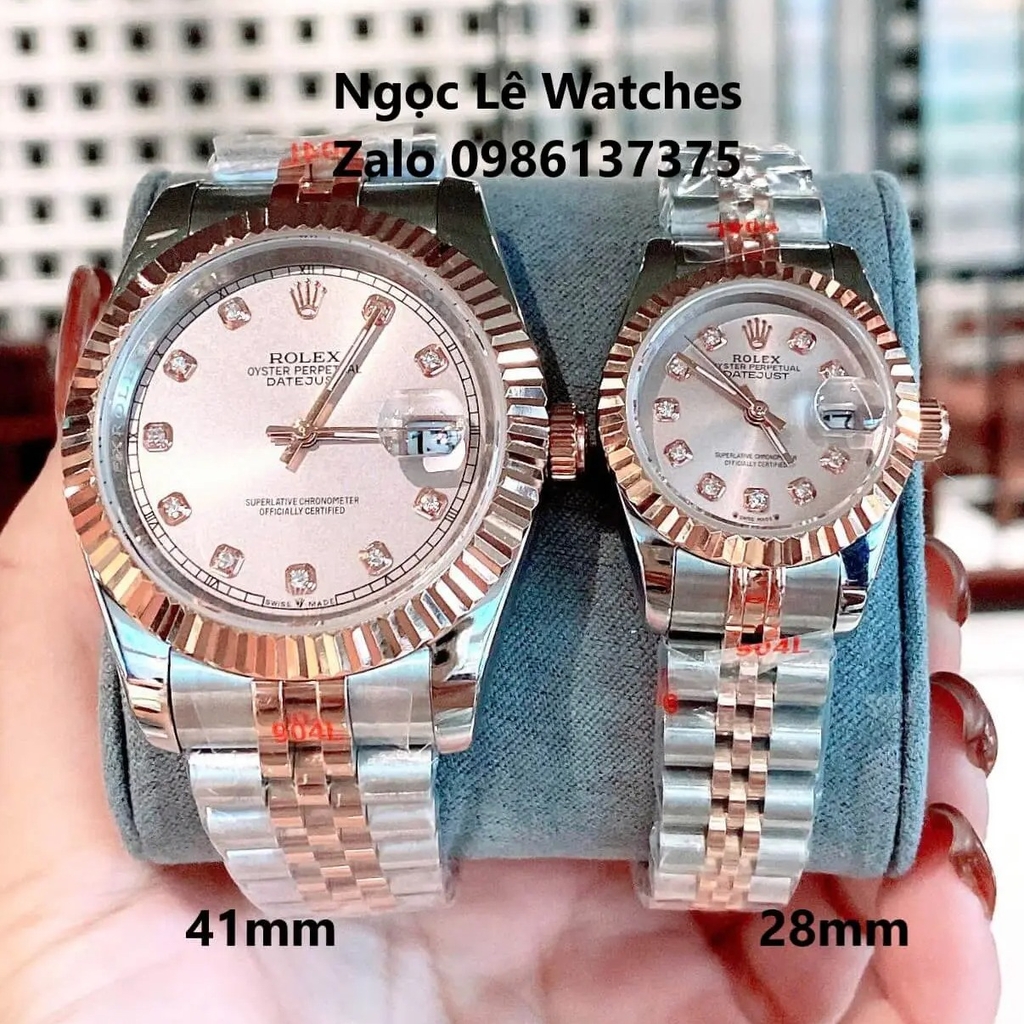 Đồng Hồ Cặp Rolex Datejust Máy Pin Nam Nữ Màu Demi Rose Viền Khía Size 41mm-28mm
