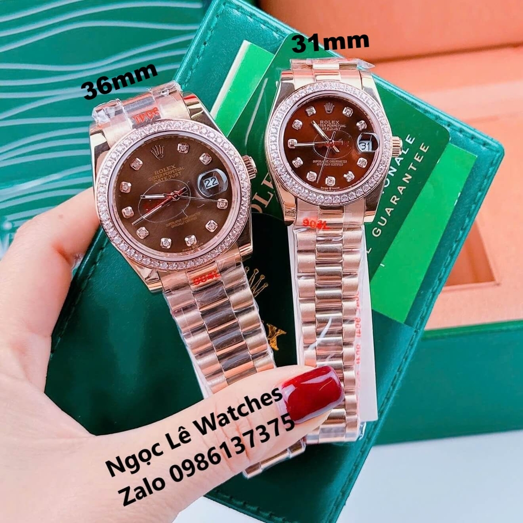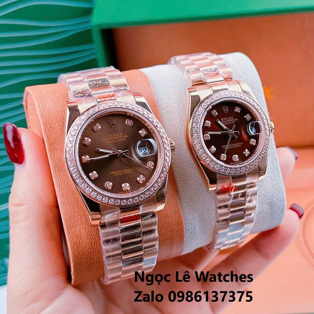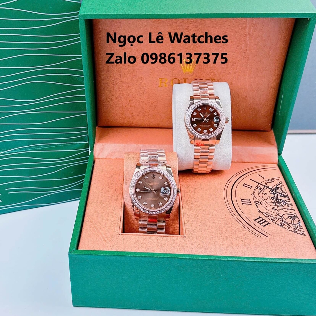 Đồng Hồ Cặp Rolex Datejust Máy Pin Màu Vàng Hồng Mặt Nâu Viền Đá Size 36mm - 31mm