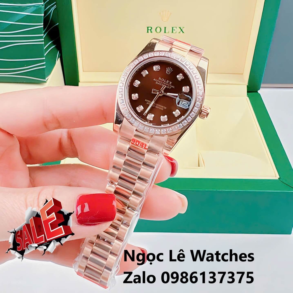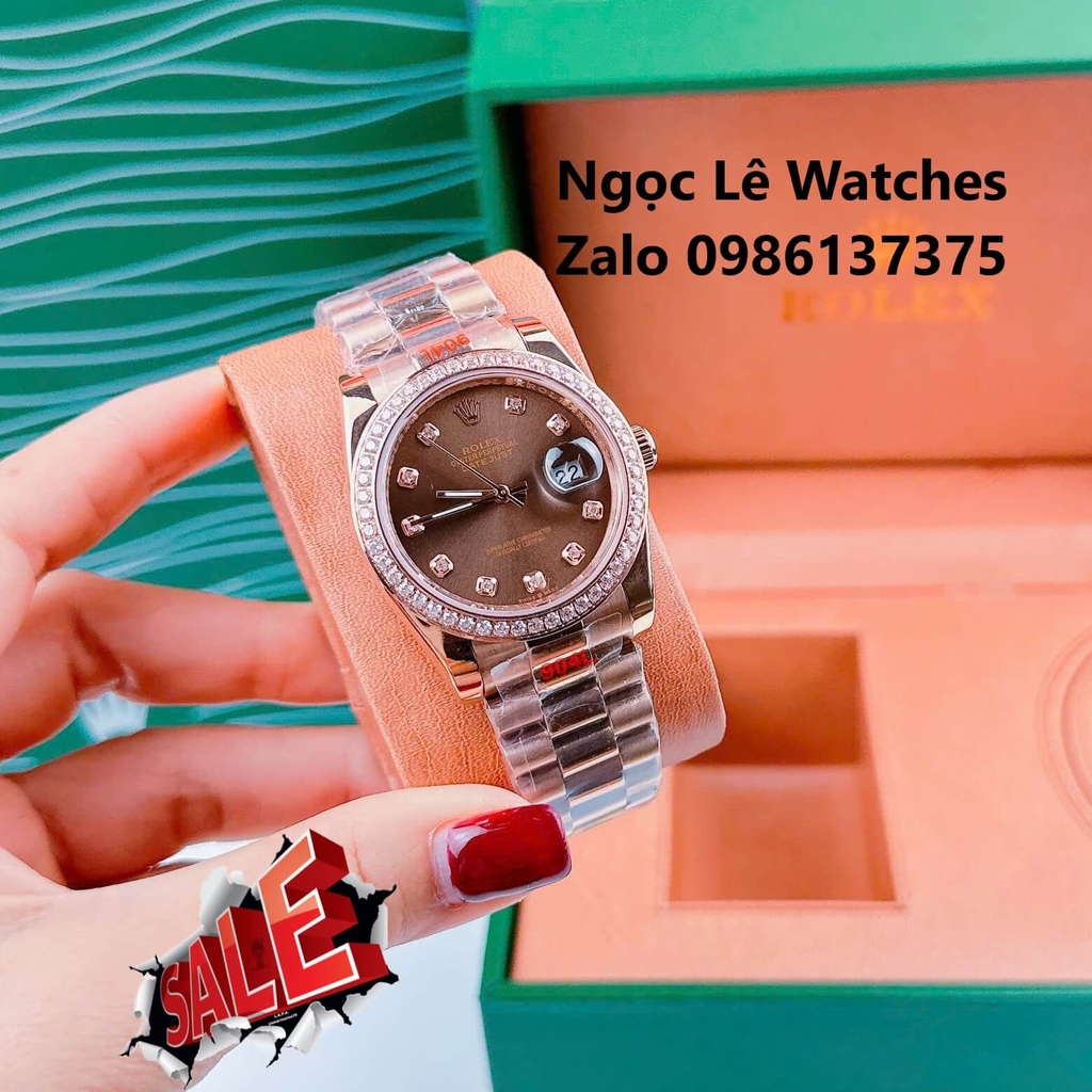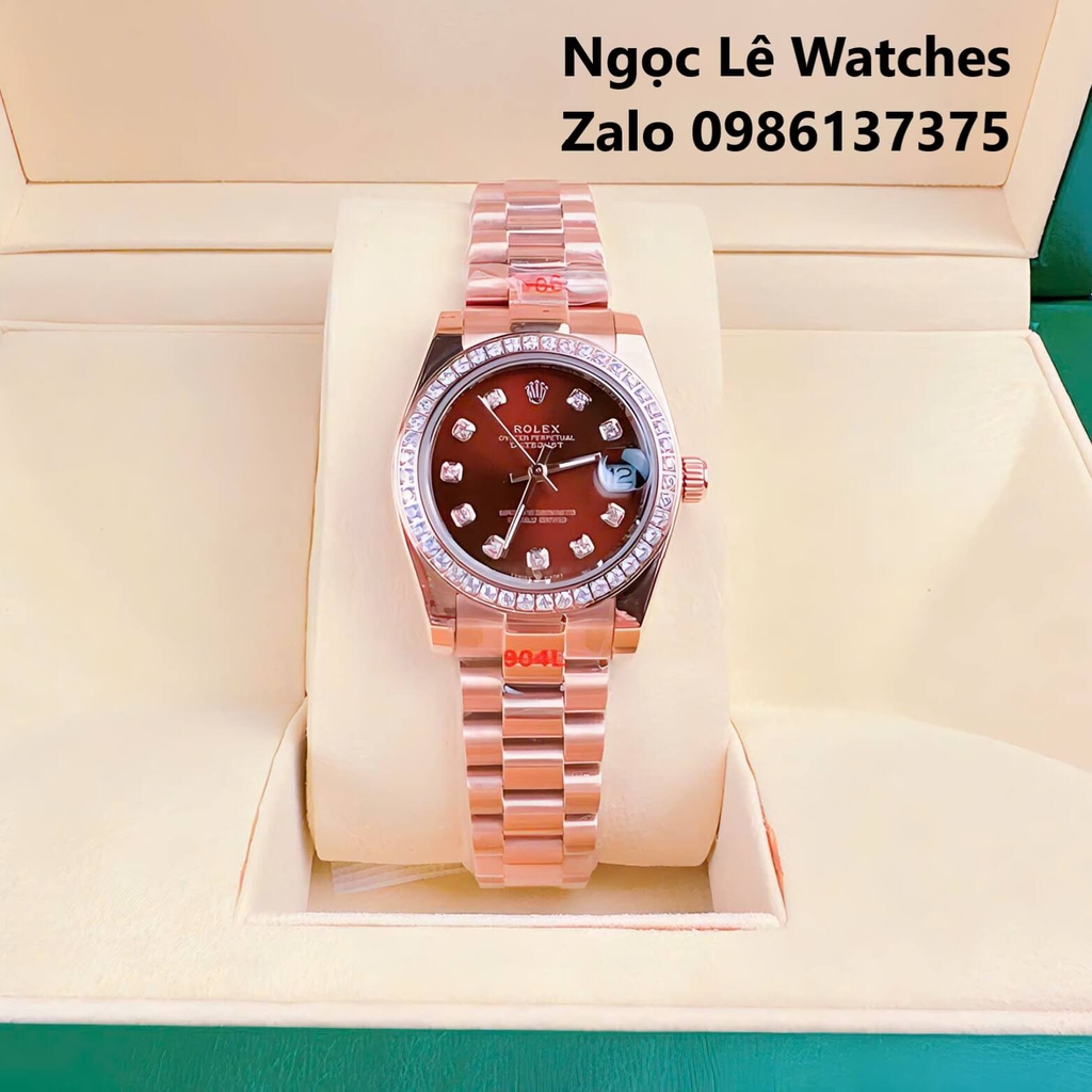 Đồng Hồ Cặp Rolex Datejust Máy Pin Màu Vàng Hồng Mặt Nâu Viền Đá Size 36mm - 31mm