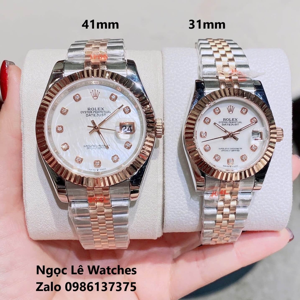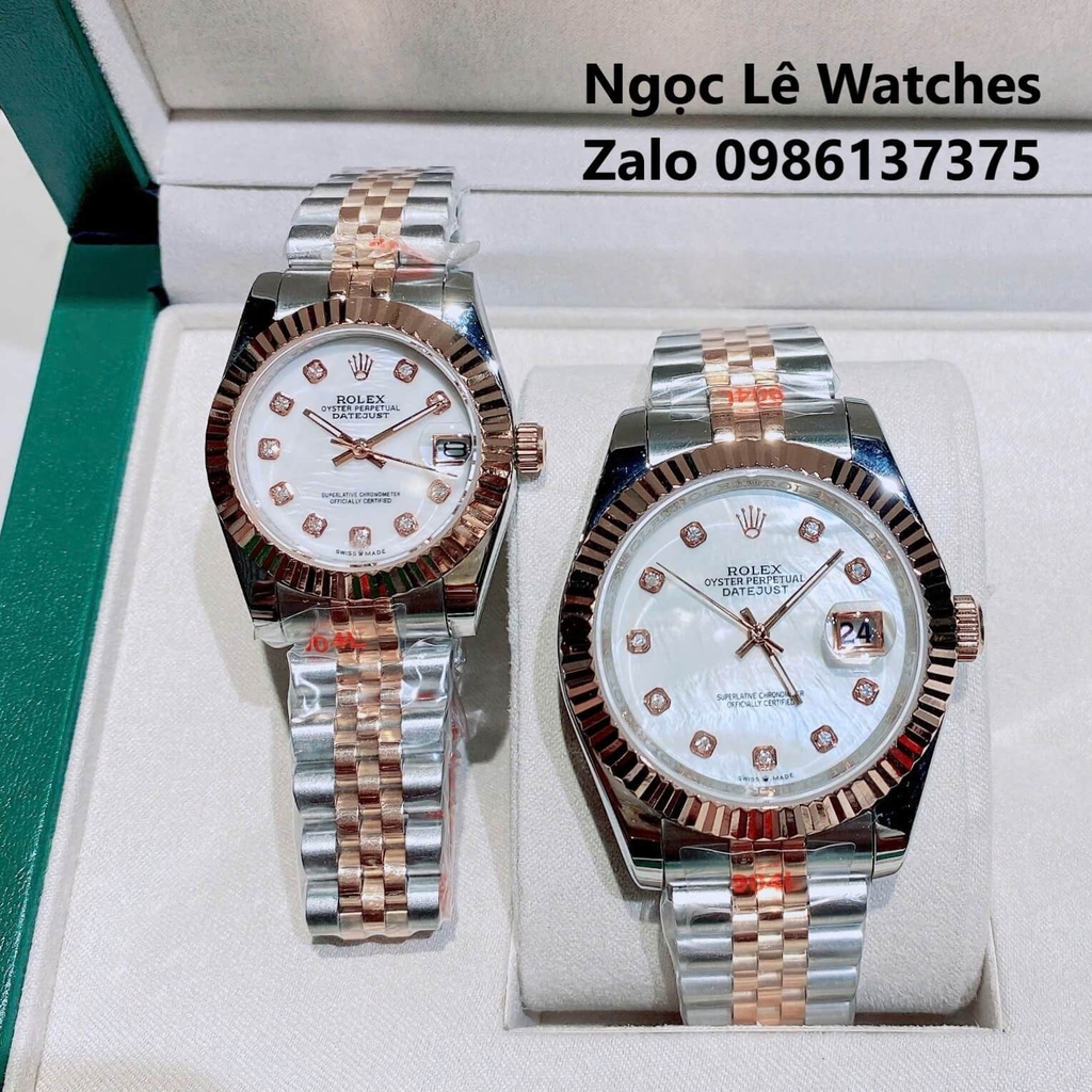Đồng Hồ Cặp Rolex Datejust Pin Demi Rose Mặt Xà Cừ Niềng Khía Size 41mm-31mm