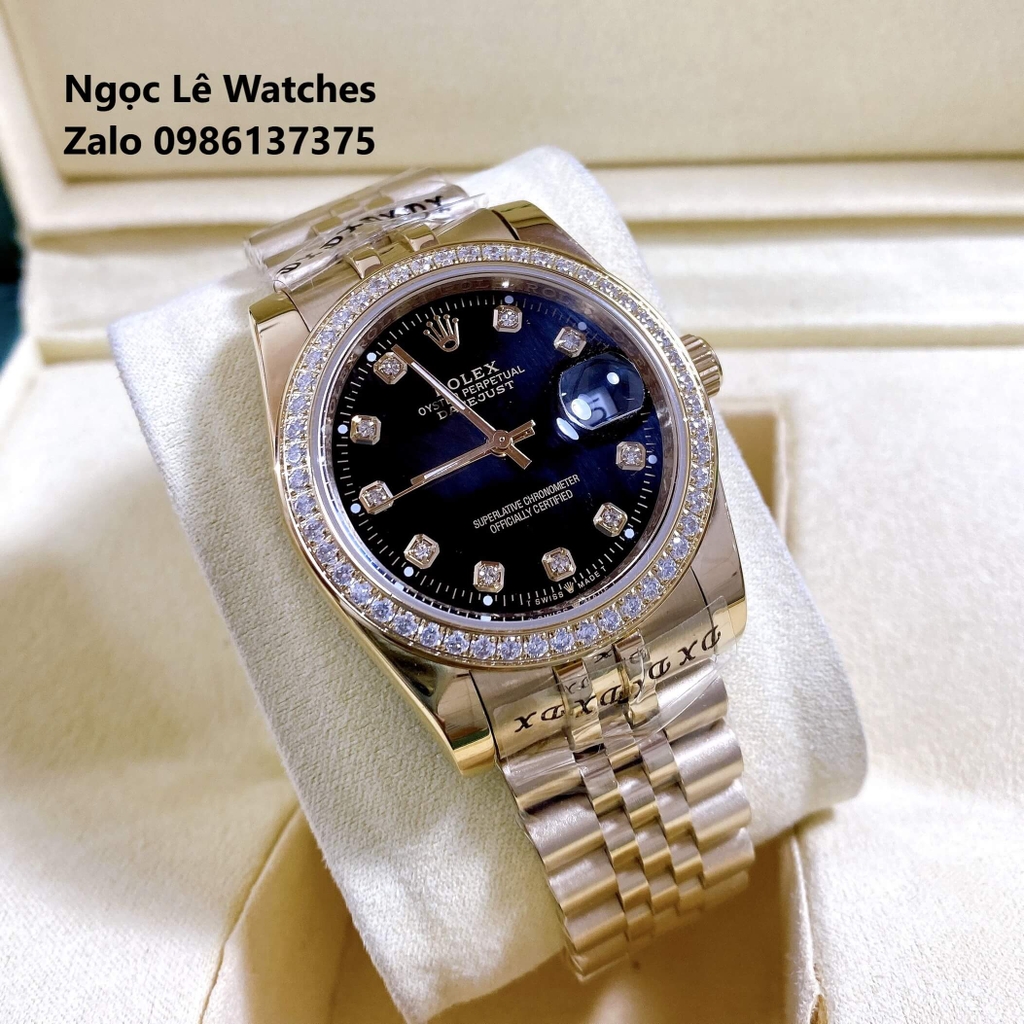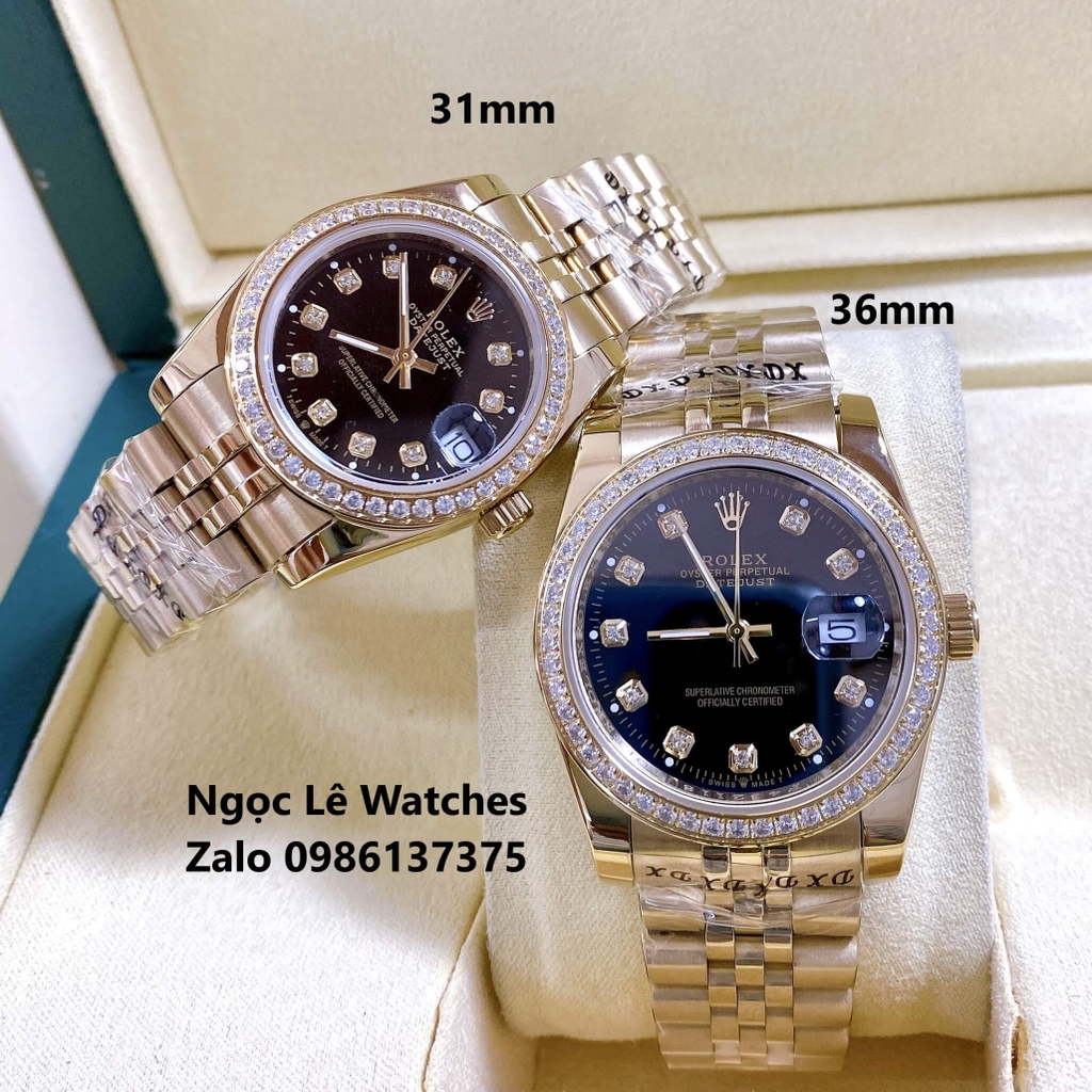 Đồng Hồ Cặp Rolex Datejust Pin Màu Vàng Mặt Đen Viền Đá Size 36mm - 31mm