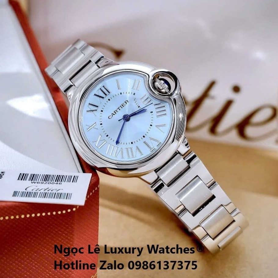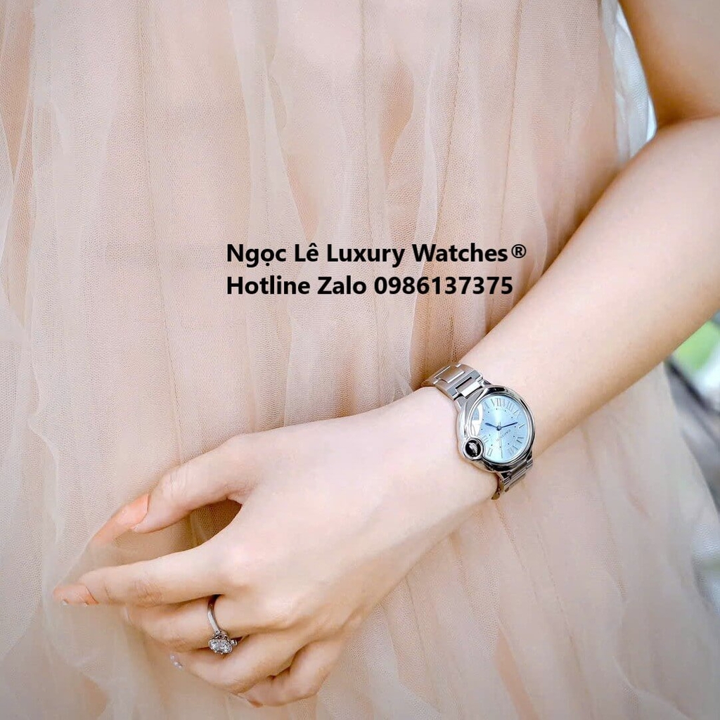 Đồng Hồ Cartier Ballon Bleu Nữ Mặt Xanh Da Trời Kim Xanh Số La Mã Size 32mm