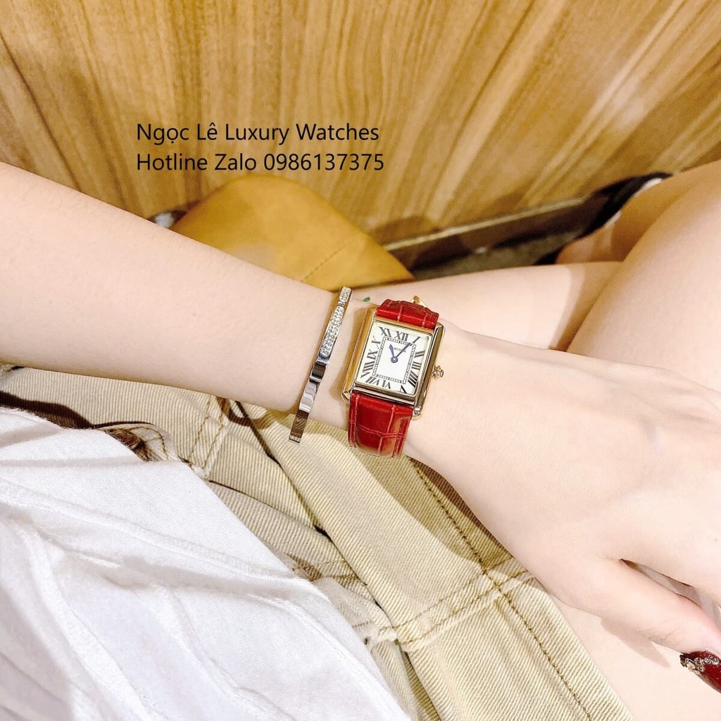 Đồng hồ Cartier tank dây da đỏ mặt chữ nhật, đồng hồ nữ dây da màu đỏ quyến rũ