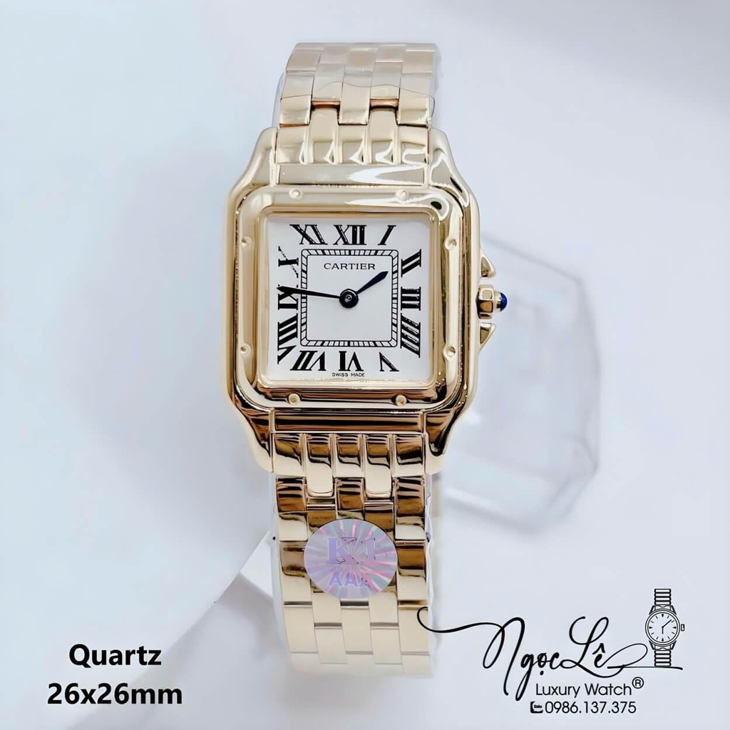 - Đồng Hồ Cartier Nữ Mặt Vuông Dây Kim Loại Vàng Mặt Trắng Size 26x26mm - Niềng Trơn