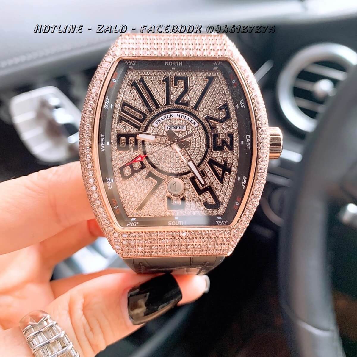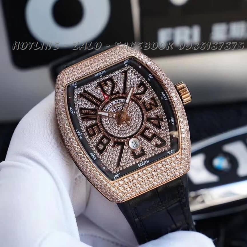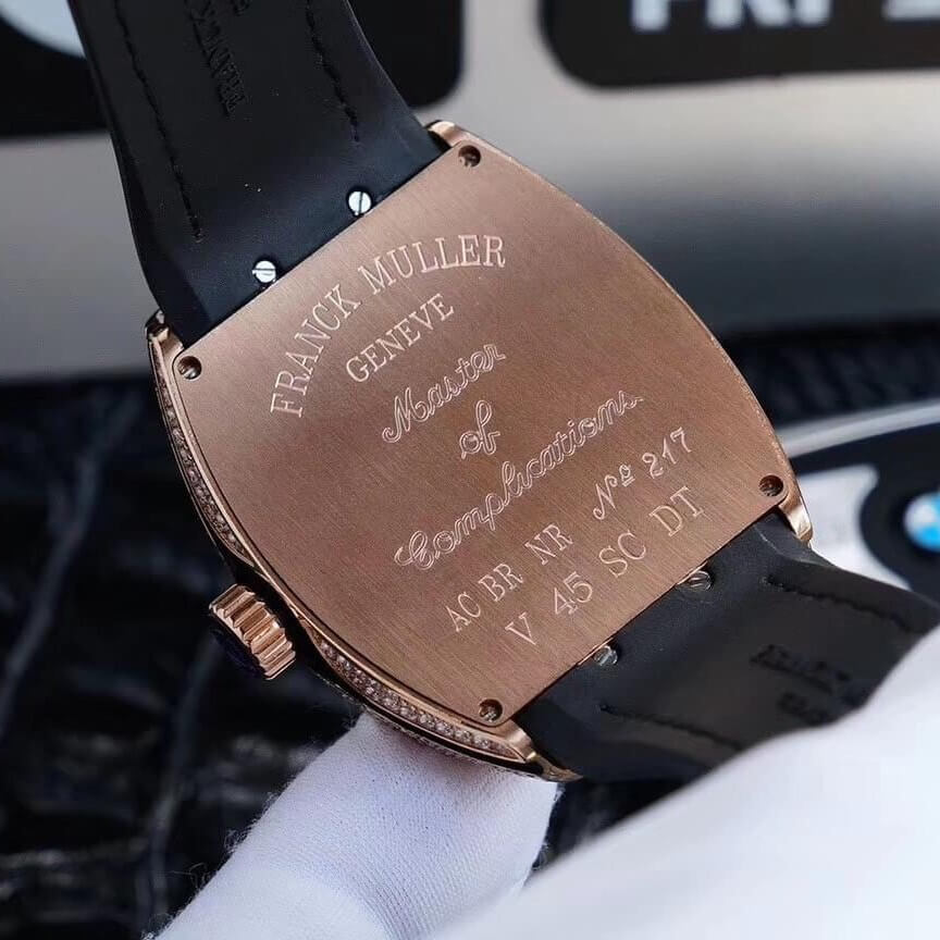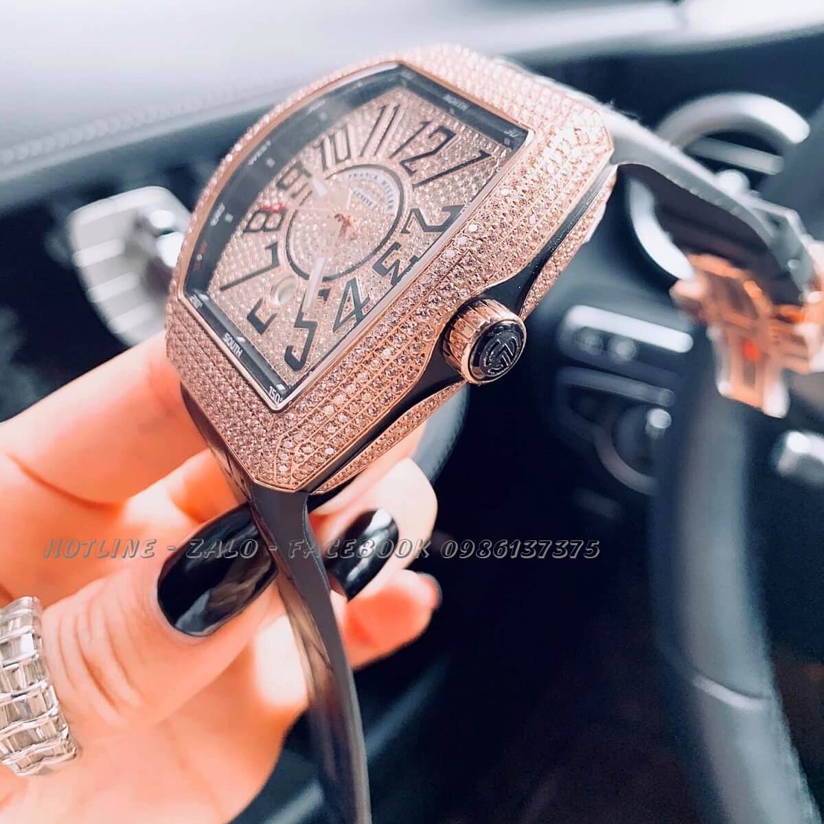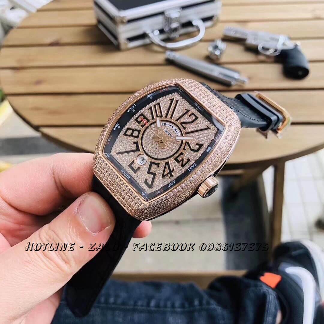 Đồng Hồ Franck Muller Nam Automatic Da Silicon Đen Đá Vàng Hồng