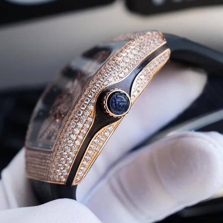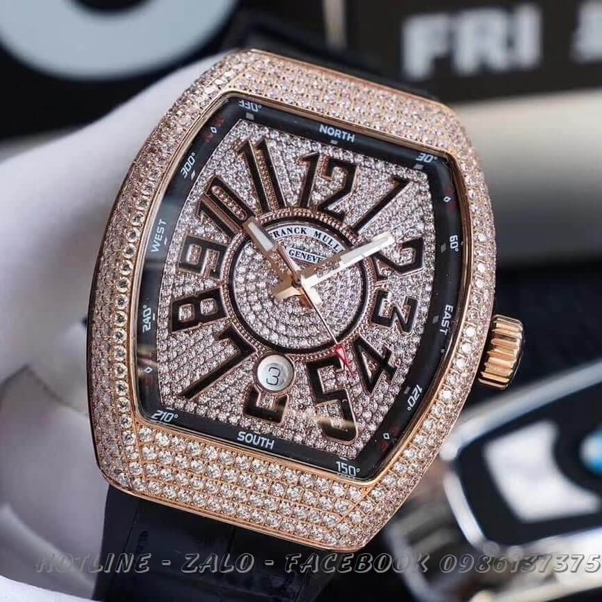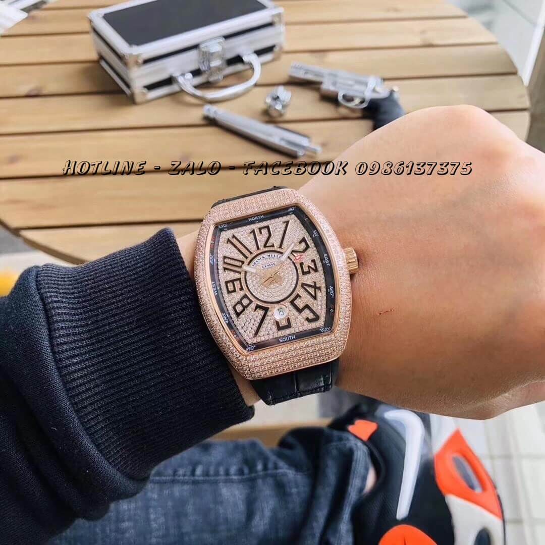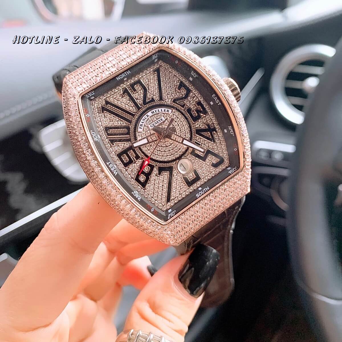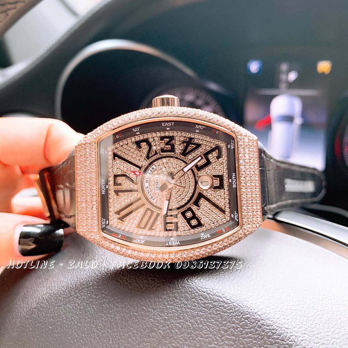 Đồng Hồ Franck Muller Nam Automatic Da Silicon Đen Đá Vàng Hồng