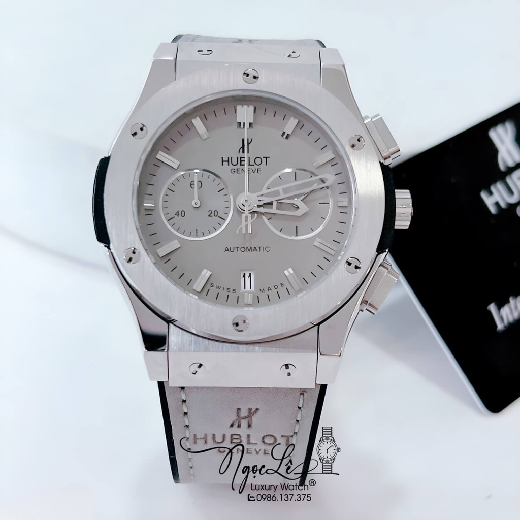 Hình anht thực tế Đồng Hồ Hublot Classic Fusion Nam Máy Pin 5 Kim Dây Da Silicon Xám Vỏ Bạc 42mm