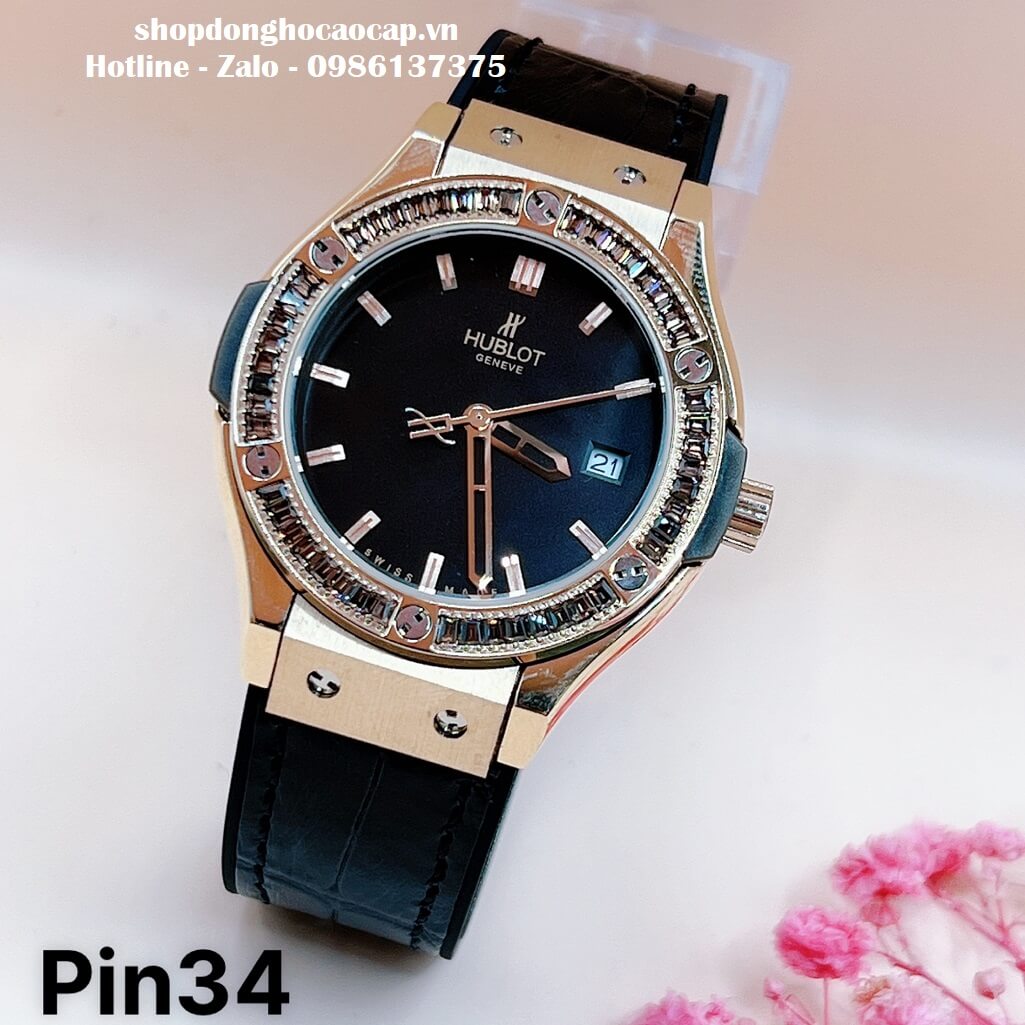 Đồng Hồ Hublot Classic Fusion Nữ Dây Da Silicon Đen Đính Đá 34mm Rose