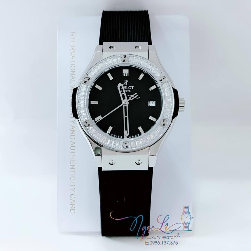 Đồng Hồ Hublot Classic Fusion Nữ Dây Silicon Đen Đính Đá Silver Size 34mm