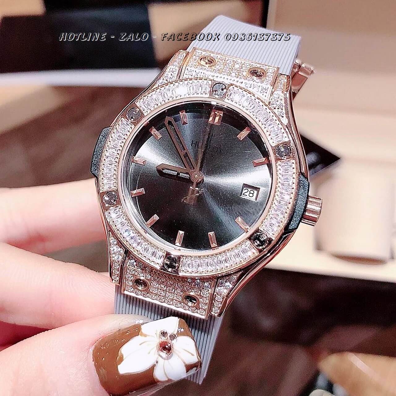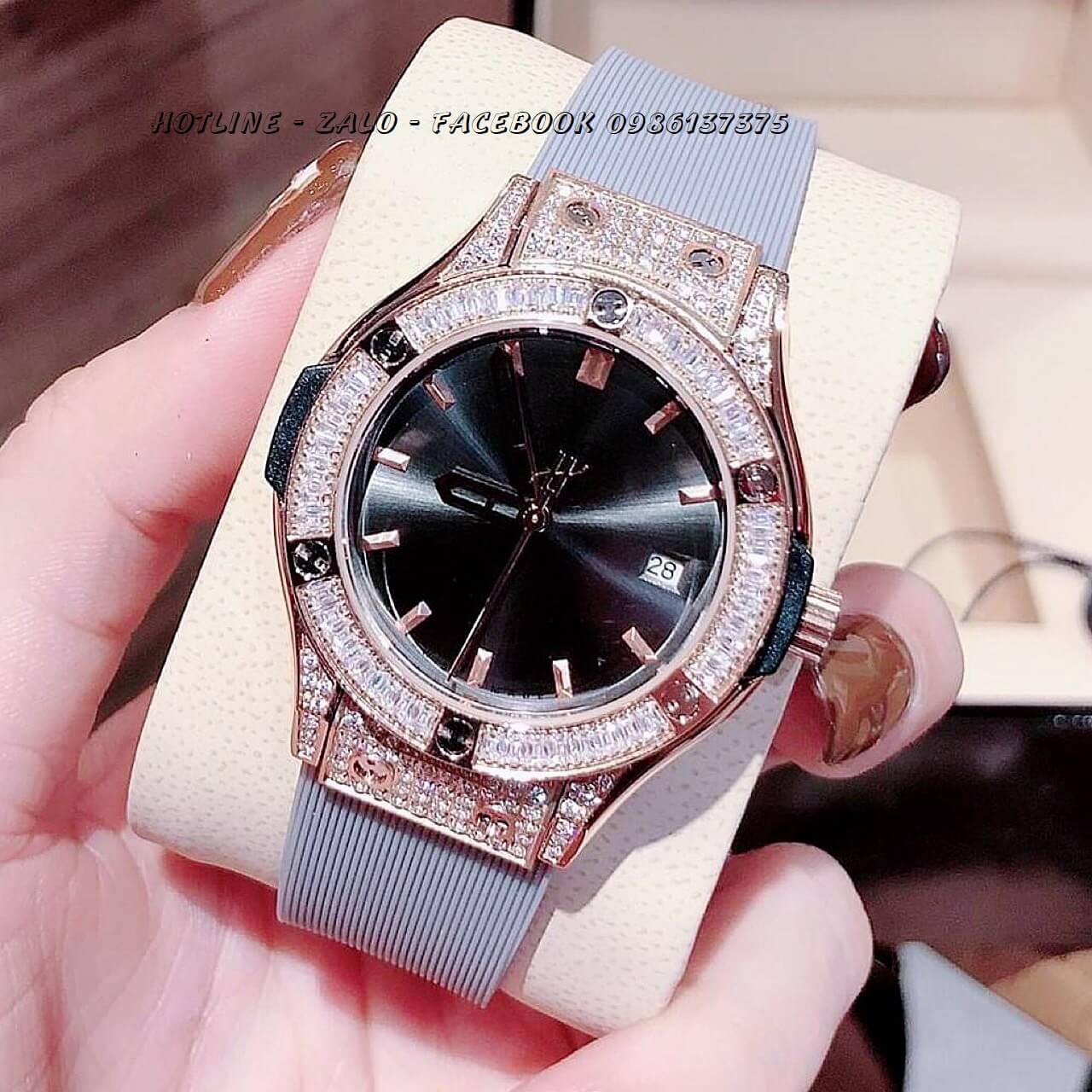 Đồng hồ Hublot nữ dây silicon xám đính đá, thiết kế mặt được đính đá swarovski rất bắt mắt và sang trọng.