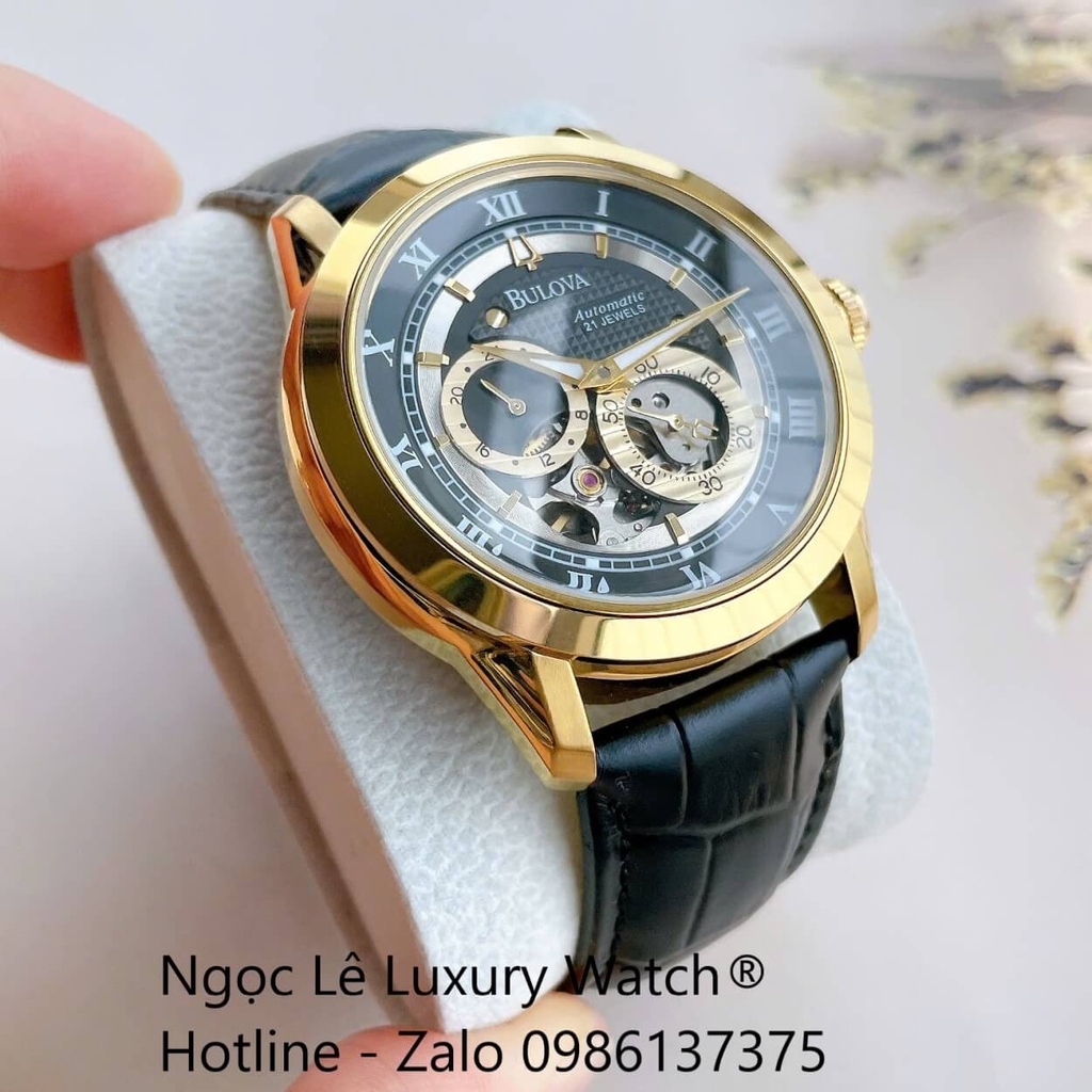 Đồng Hồ Nam Bulova 96A118 Tự Động Dây Da Đen Mặt Đen Vỏ Vàng Gold Size 42mm