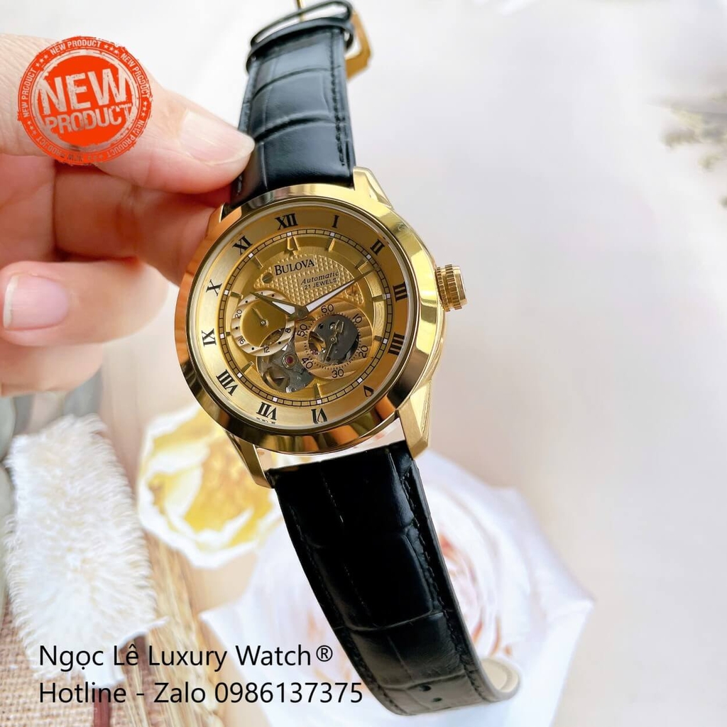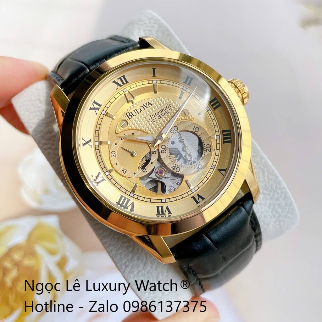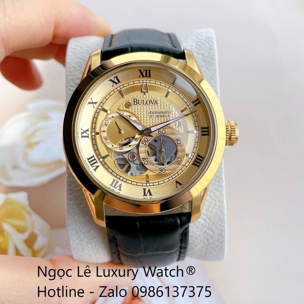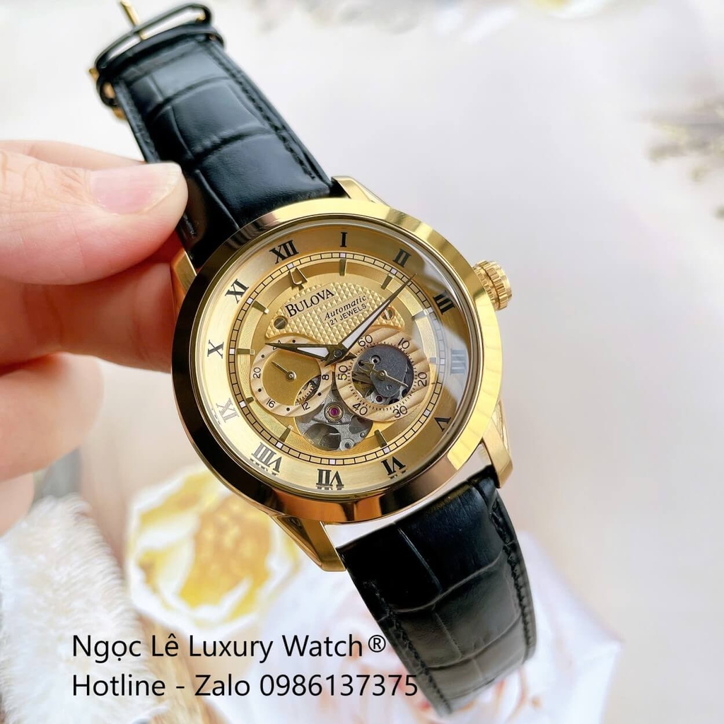 Đồng Hồ Nam Bulova 96A118 Tự Động Dây Da Đen Mặt Vàng Vỏ Vàng Gold Size 42mm