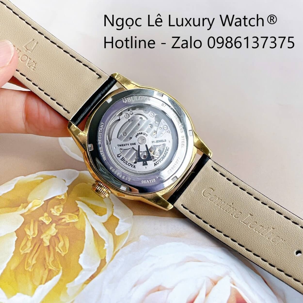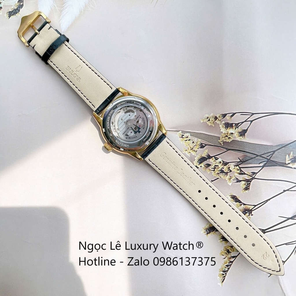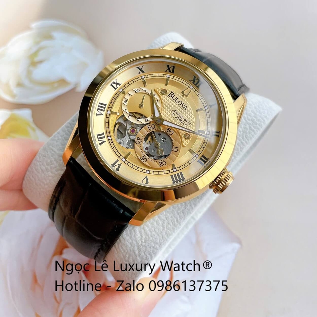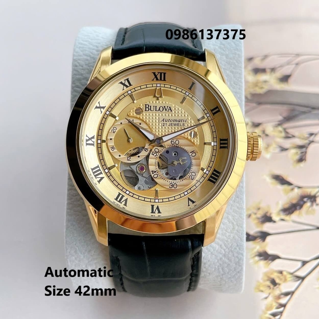 Đồng Hồ Nam Bulova 96A118 Tự Động Dây Da Đen Mặt Vàng Vỏ Vàng Gold Size 42mm