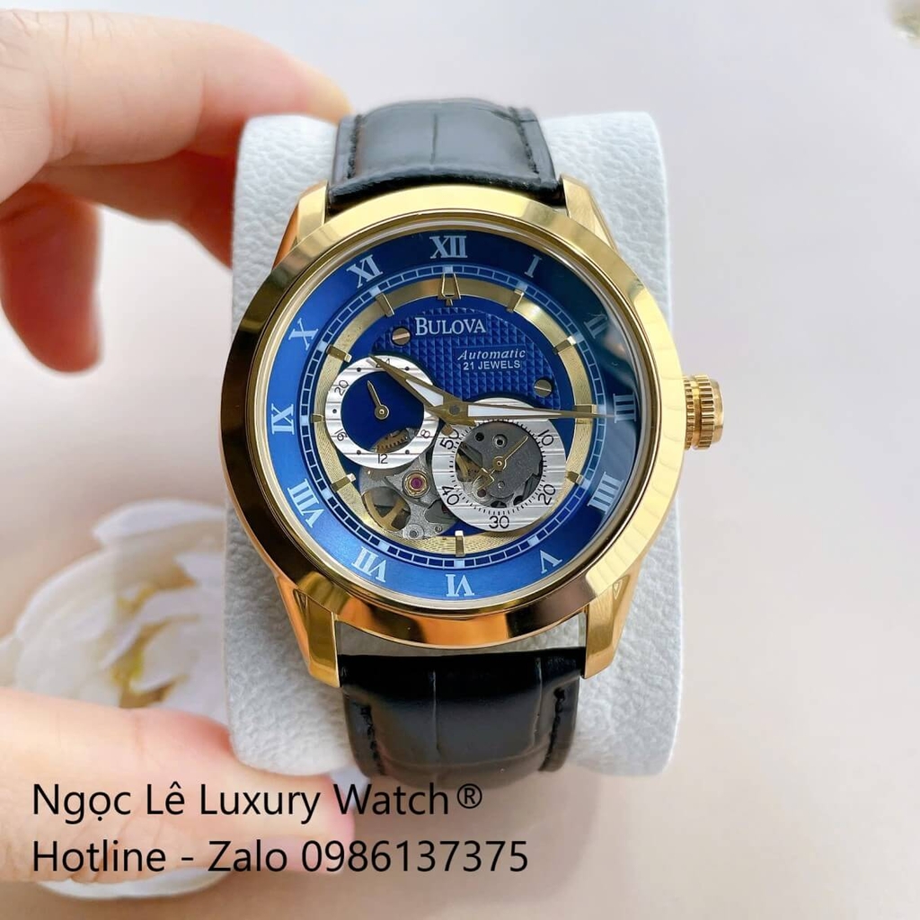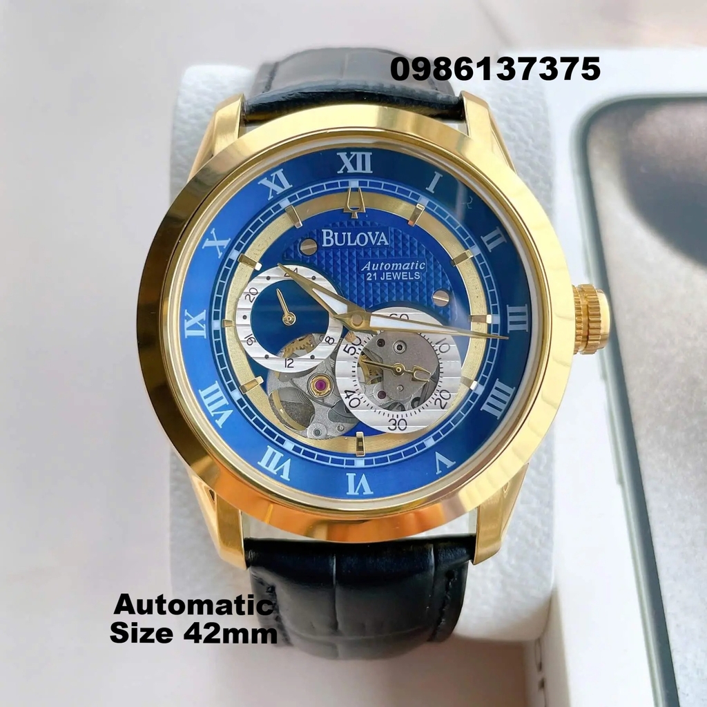 Đồng Hồ Nam Bulova 96A118 Tự Động Dây Da Đen Mặt Xanh Dương Vỏ Vàng Gold Size 42mm
