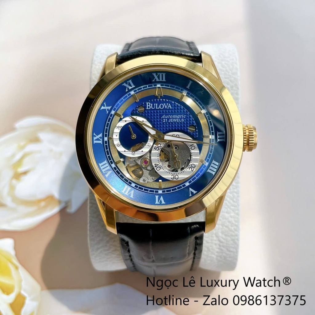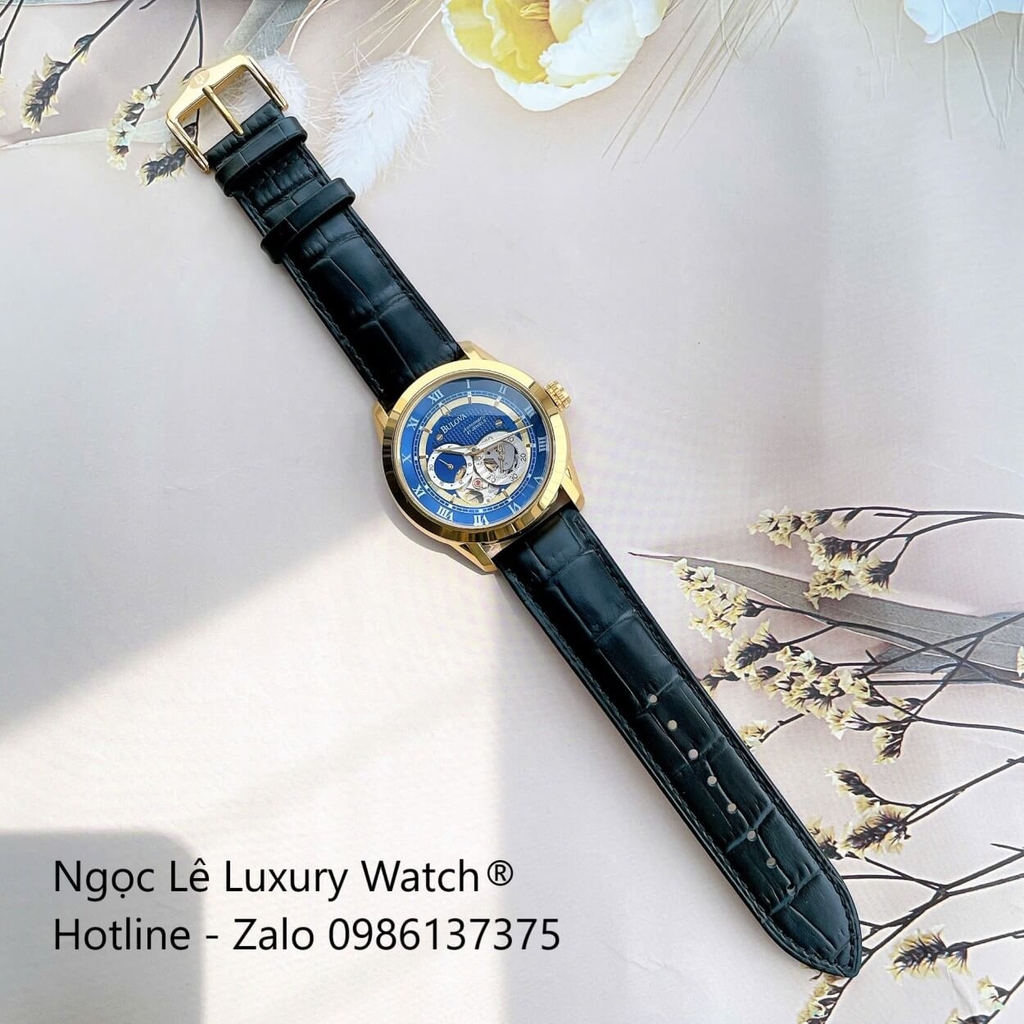 Đồng Hồ Nam Bulova 96A118 Automatic Dây Da Đen Mặt Xanh Dương Vỏ Gold 42mm