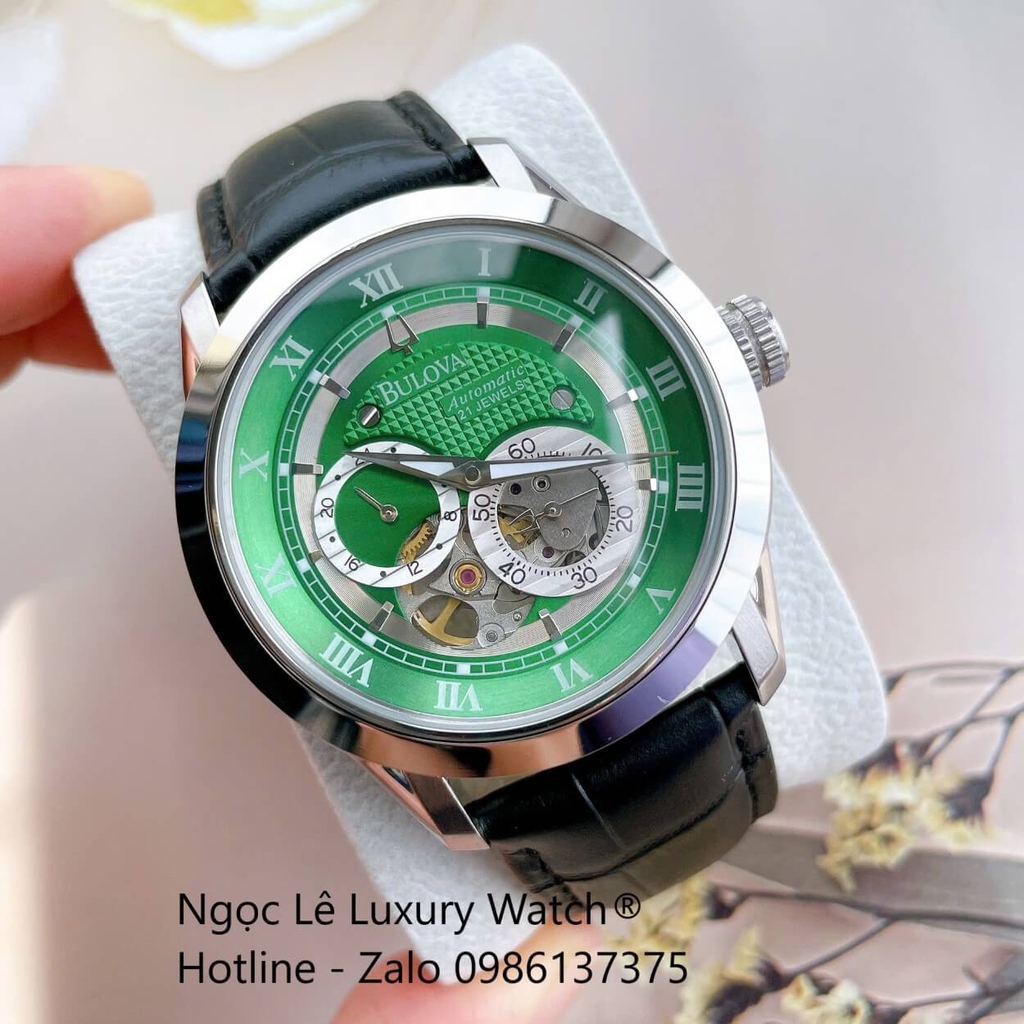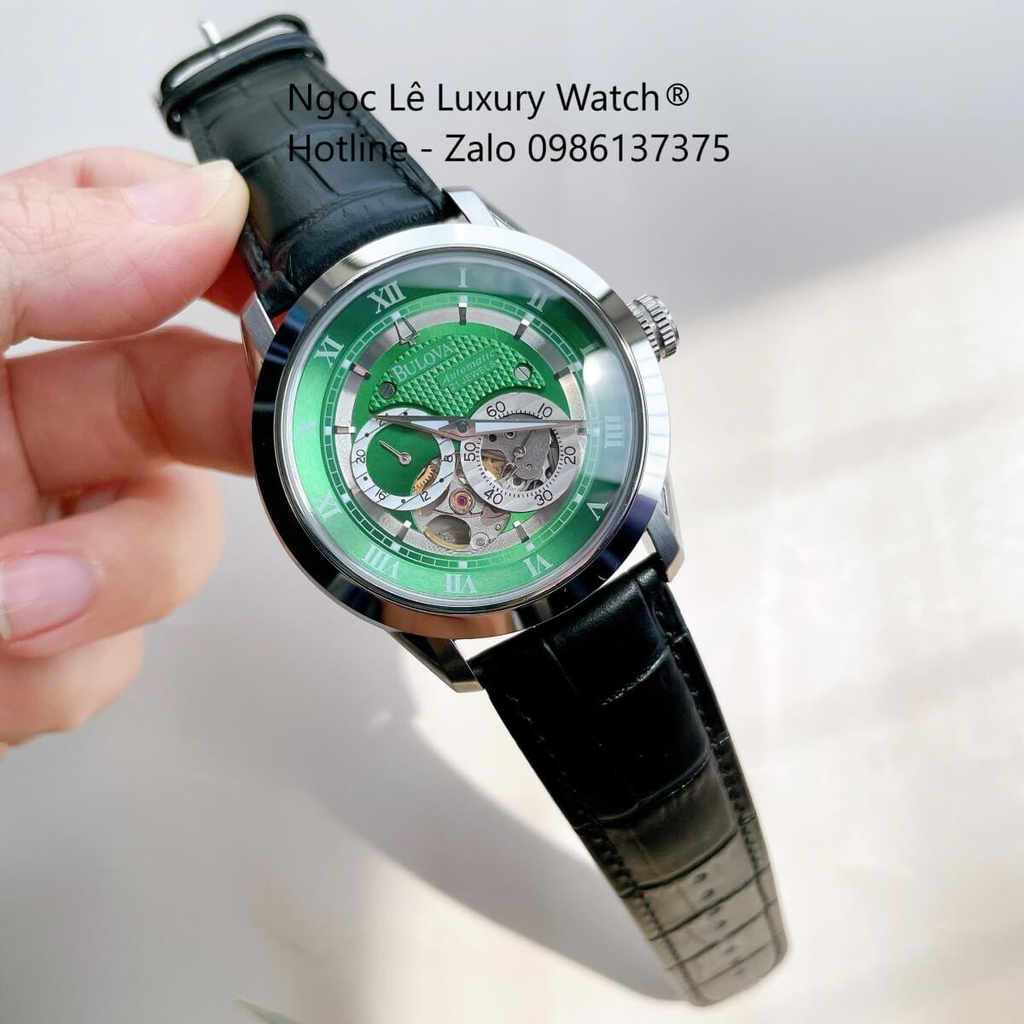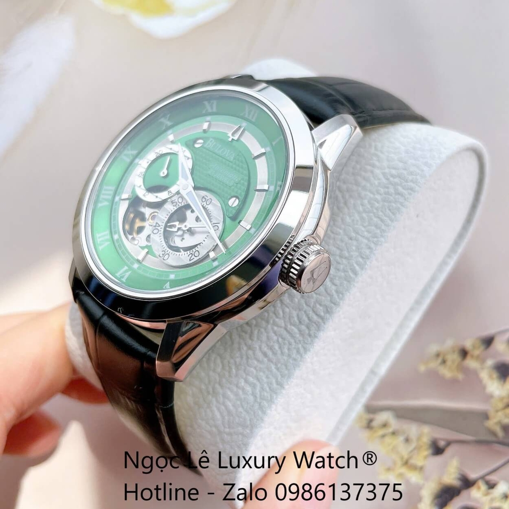 Đồng Hồ Nam Bulova 96A118 Tự Động Dây Da Đen Mặt Xanh Lá Vỏ Silver Size 42mm