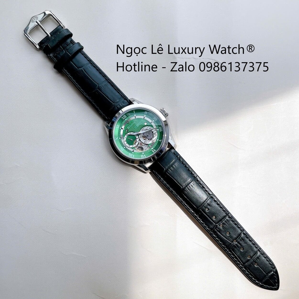 Mặt đồng hồ xanh lá ánh khói nổi bật với chi tiết open heart lộ cơ trước sau, cho phép người đeo chiêm ngưỡng nhịp chuyển động của bộ máy cơ.