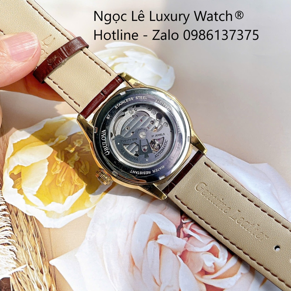 Phiên bản Bulova 96A118 gây ấn tượng với mặt lộ cơ trước sau, thể hiện tinh hoa của nghệ thuật chế tác đồng hồ cơ học. Tông màu nâu trầm kết hợp vỏ vàng gold sáng bóng, tạo nên vẻ đẹp vừa cổ điển vừa hiện đại, phù hợp cả khi đi làm, dự tiệc hay gặp gỡ đối tác.