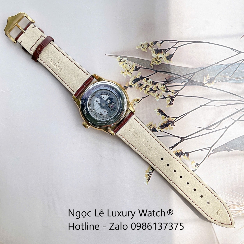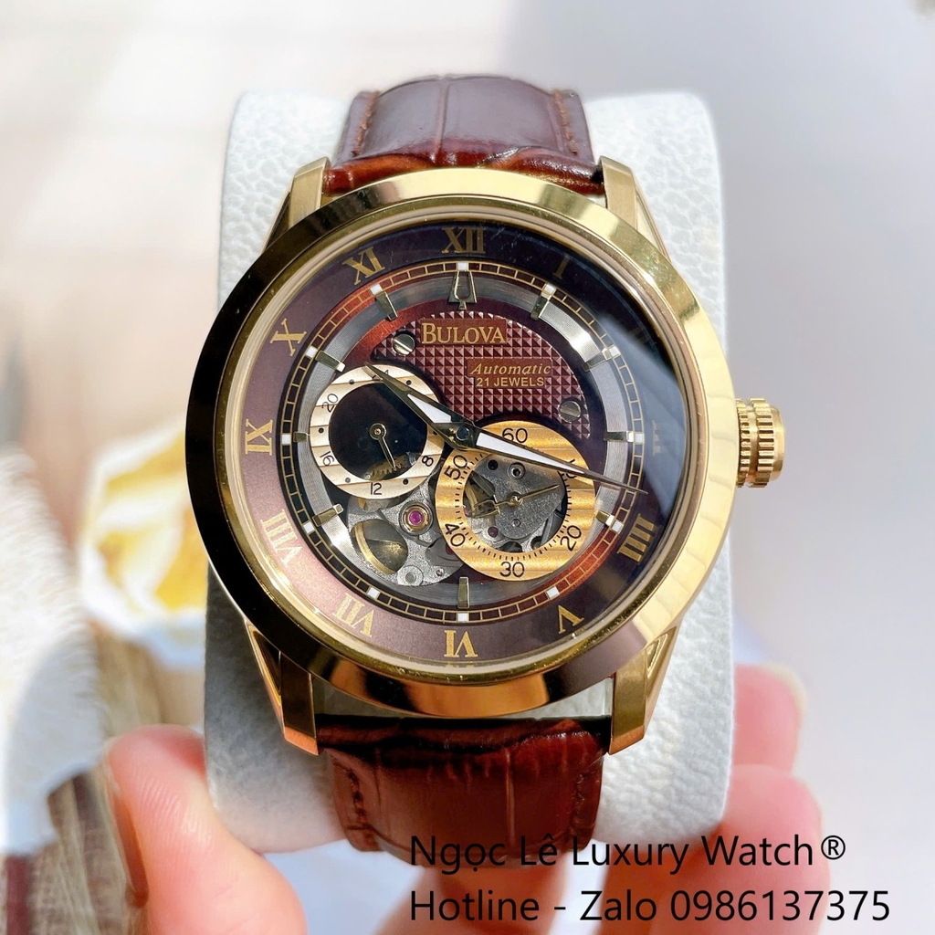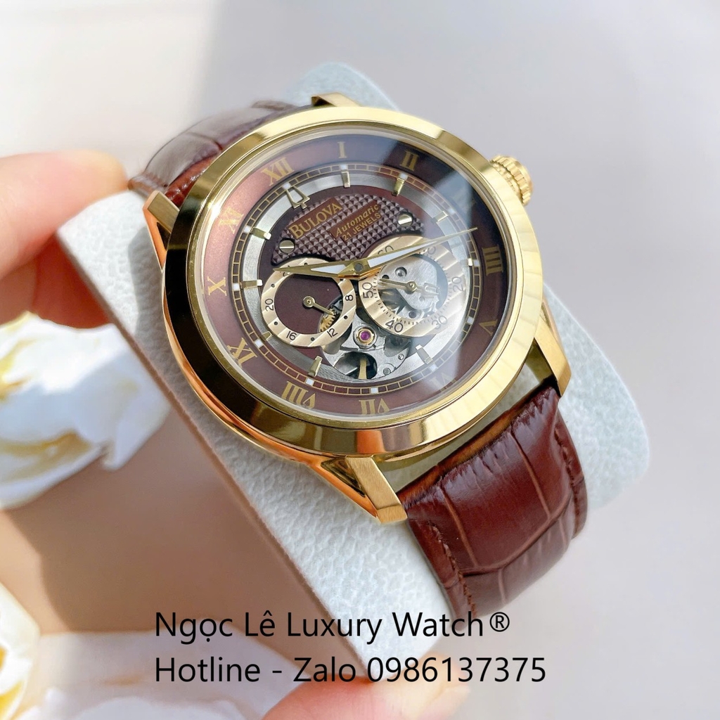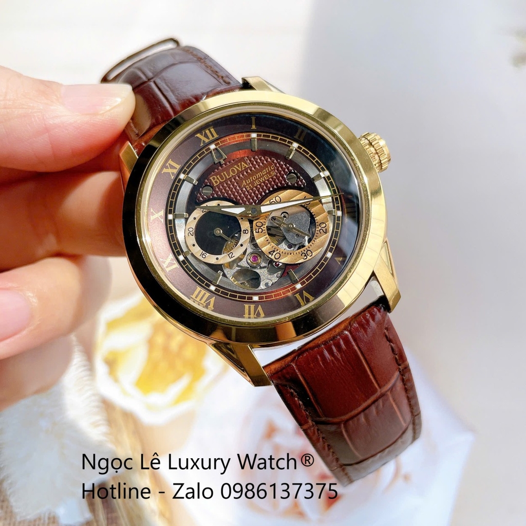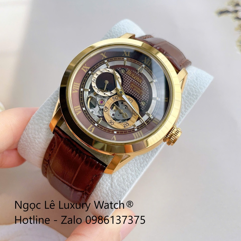 Đồng Hồ Nam Bulova 96A118 Tự Động Dây Da Nâu Mặt Nâu Vỏ Vàng Gold Size 42mm