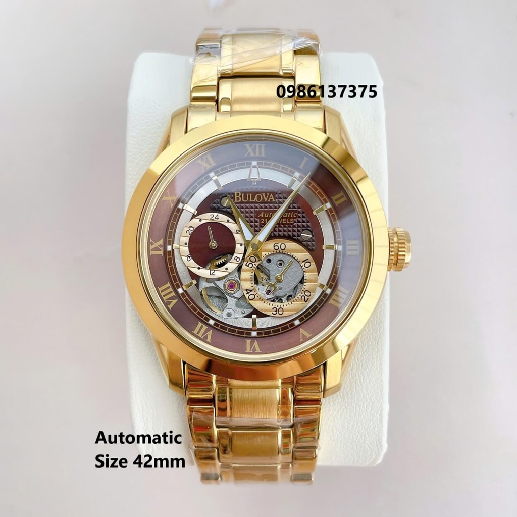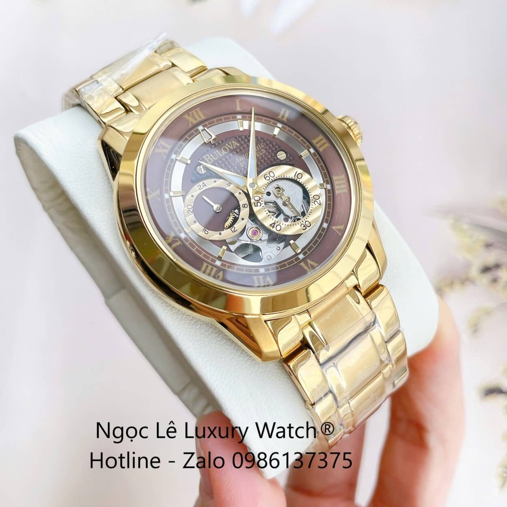 ĐỒNG HỒ NAM BULOVA 96A118 TỰ ĐỘNG DÂY KIM LOẠI VÀNG MẶT NÂU SIZE 42MM (GOLD)