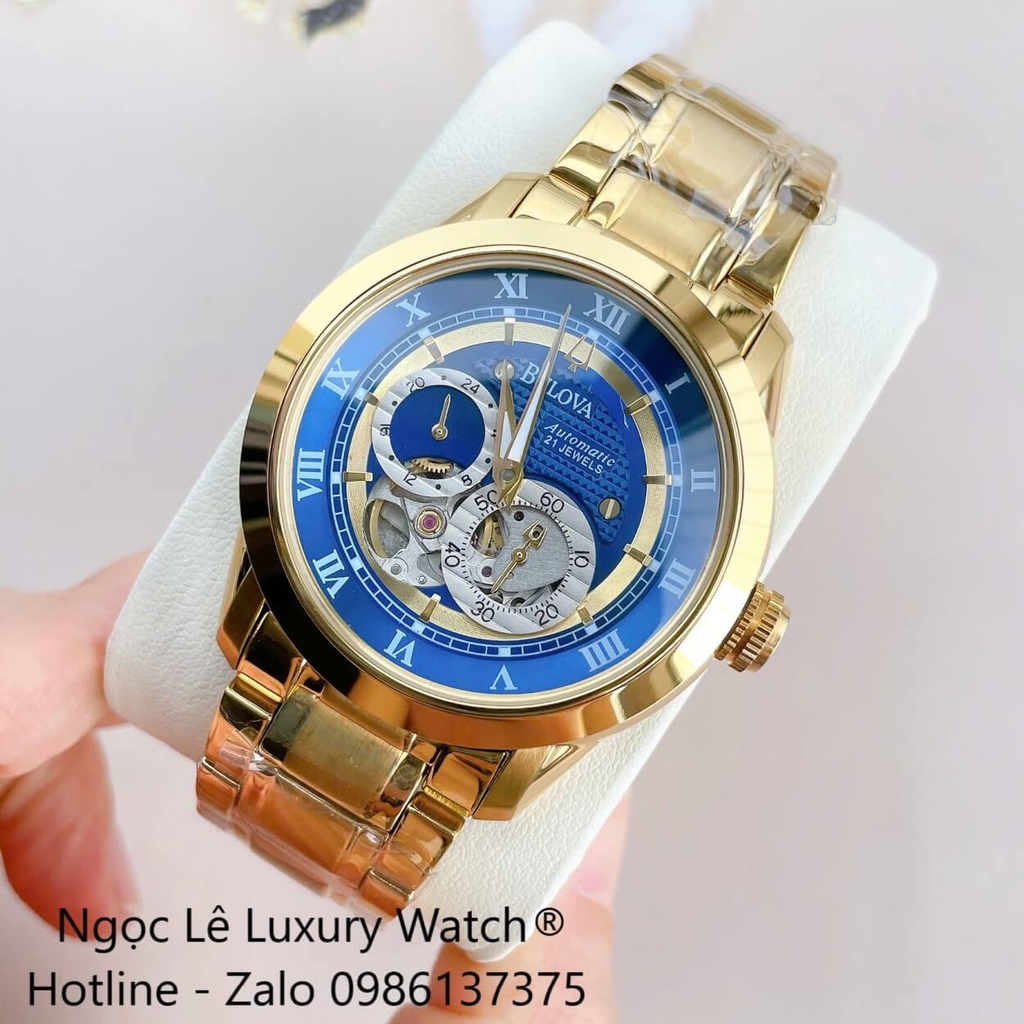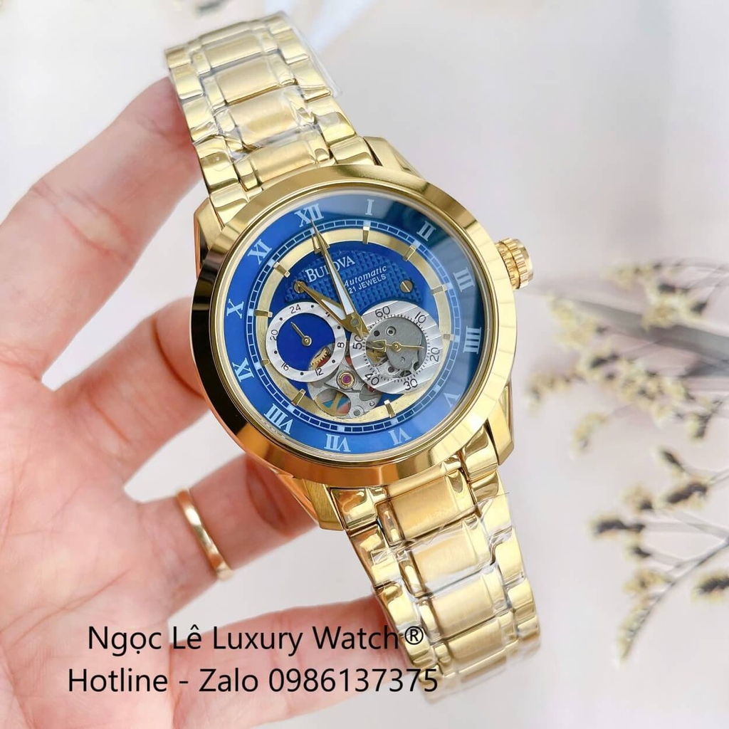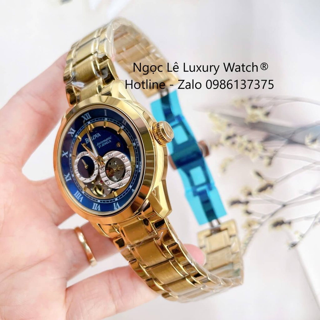 ĐỒNG HỒ NAM BULOVA 96A118 TỰ ĐỘNG DÂY KIM LOẠI VÀNG MẶT XANH DƯƠNG SIZE 42MM (GOLD)