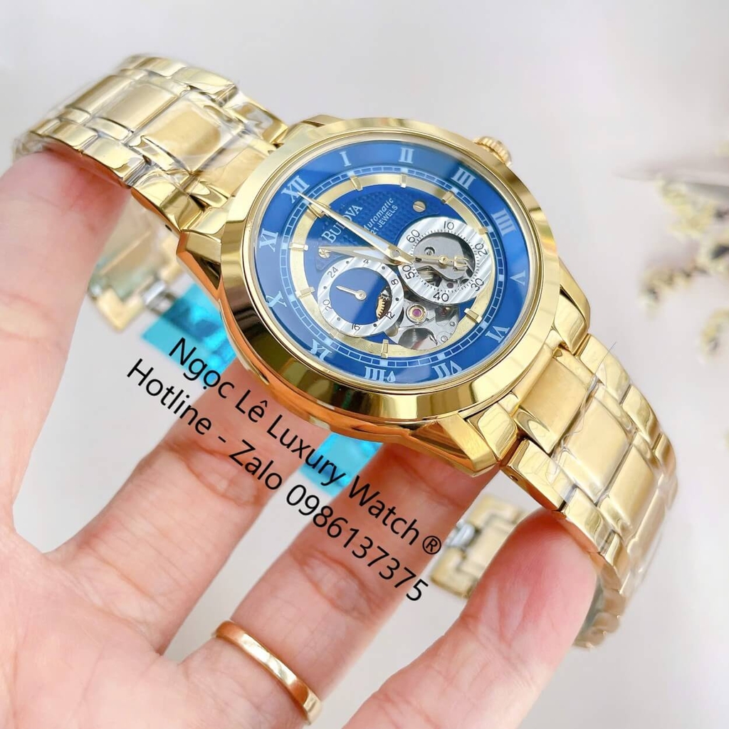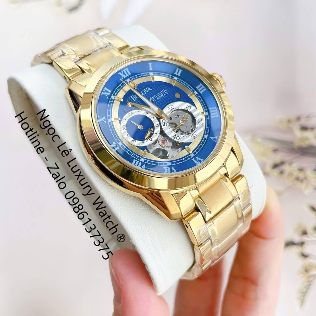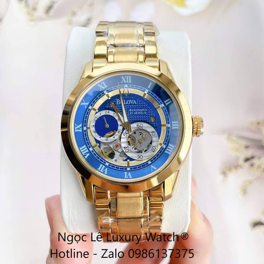 ĐỒNG HỒ NAM BULOVA 96A118 TỰ ĐỘNG DÂY KIM LOẠI VÀNG MẶT XANH DƯƠNG SIZE 42MM (GOLD)