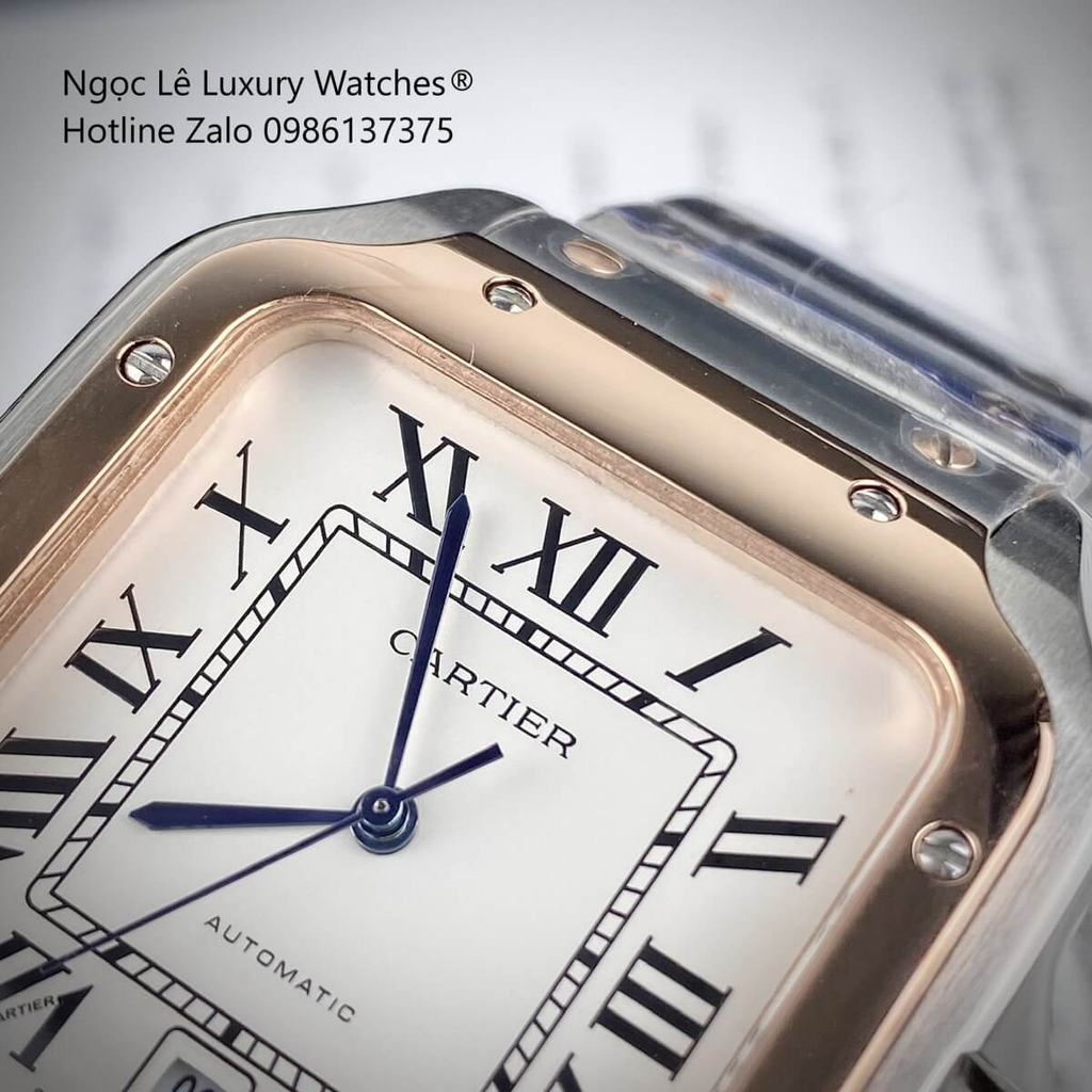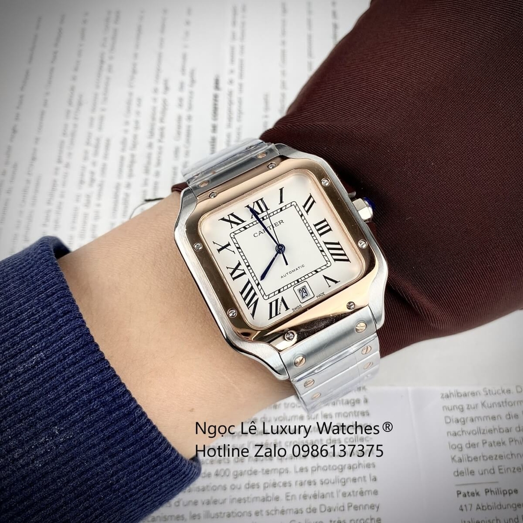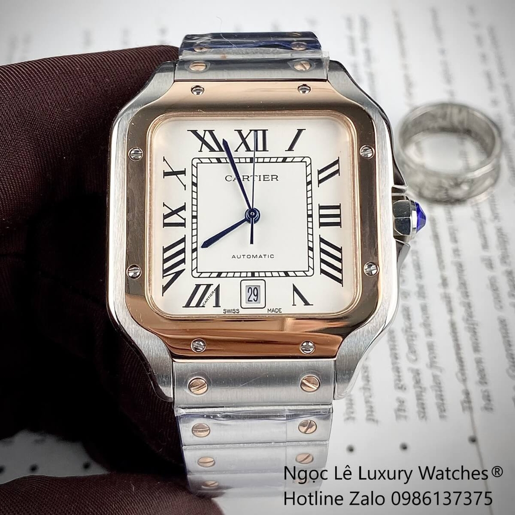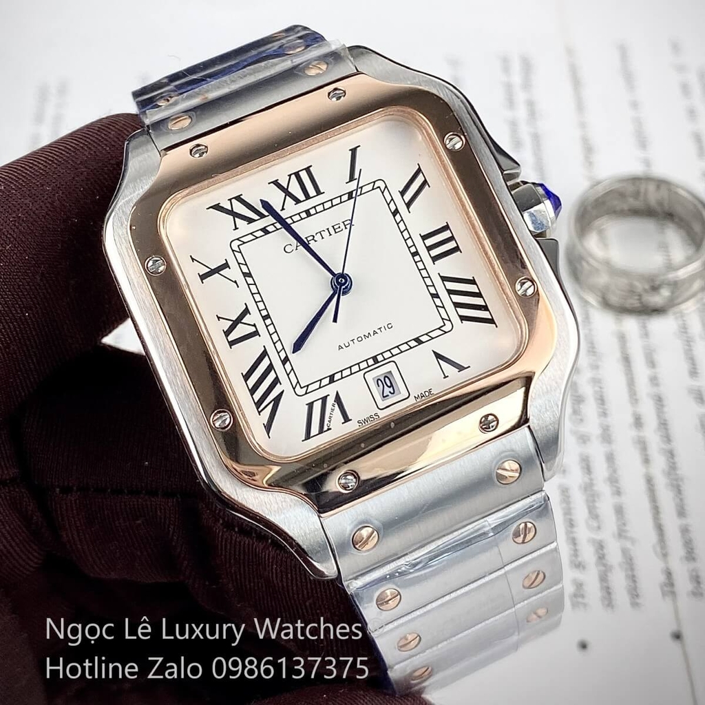 Đồng Hồ Nam Cartier Santos Automatic Dây Kim Loại Demi Rose Mặt Trắng Size 38x38mm