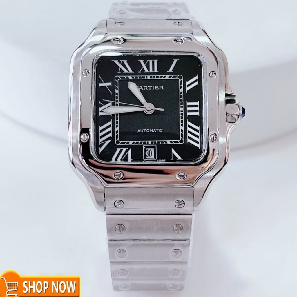 Đồng Hồ Nam Cartier Santos Automatic Dây Kim Loại Silver Mặt Đen Size 38x38mm