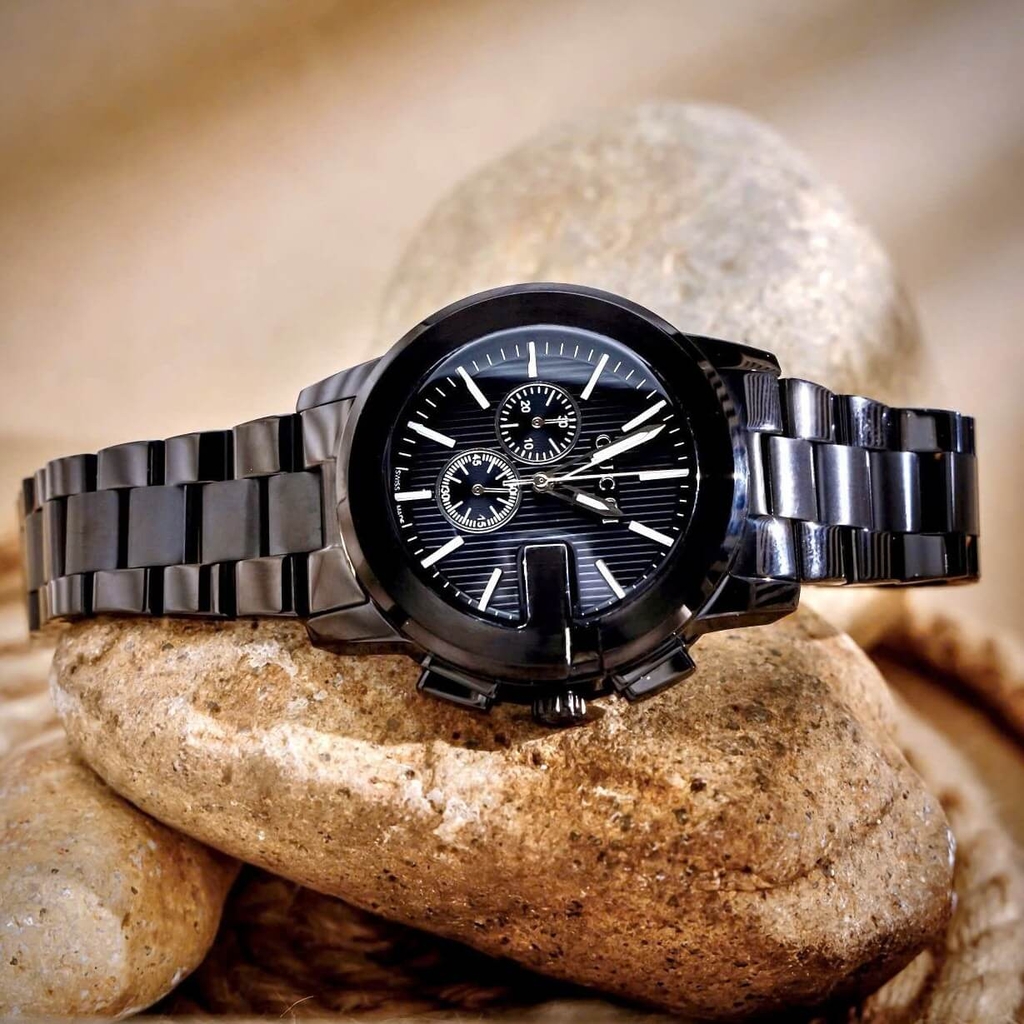 Gucci G-Chrono YA101331 là mẫu đồng hồ nam mang đậm chất sang trọng, mạnh mẽ và hiện đại. Thiết kế mặt đen nam tính, kết hợp dây & vỏ thép không gỉ màu đen cao cấp, tạo nên vẻ ngoài đầy cá tính và thời thượng.