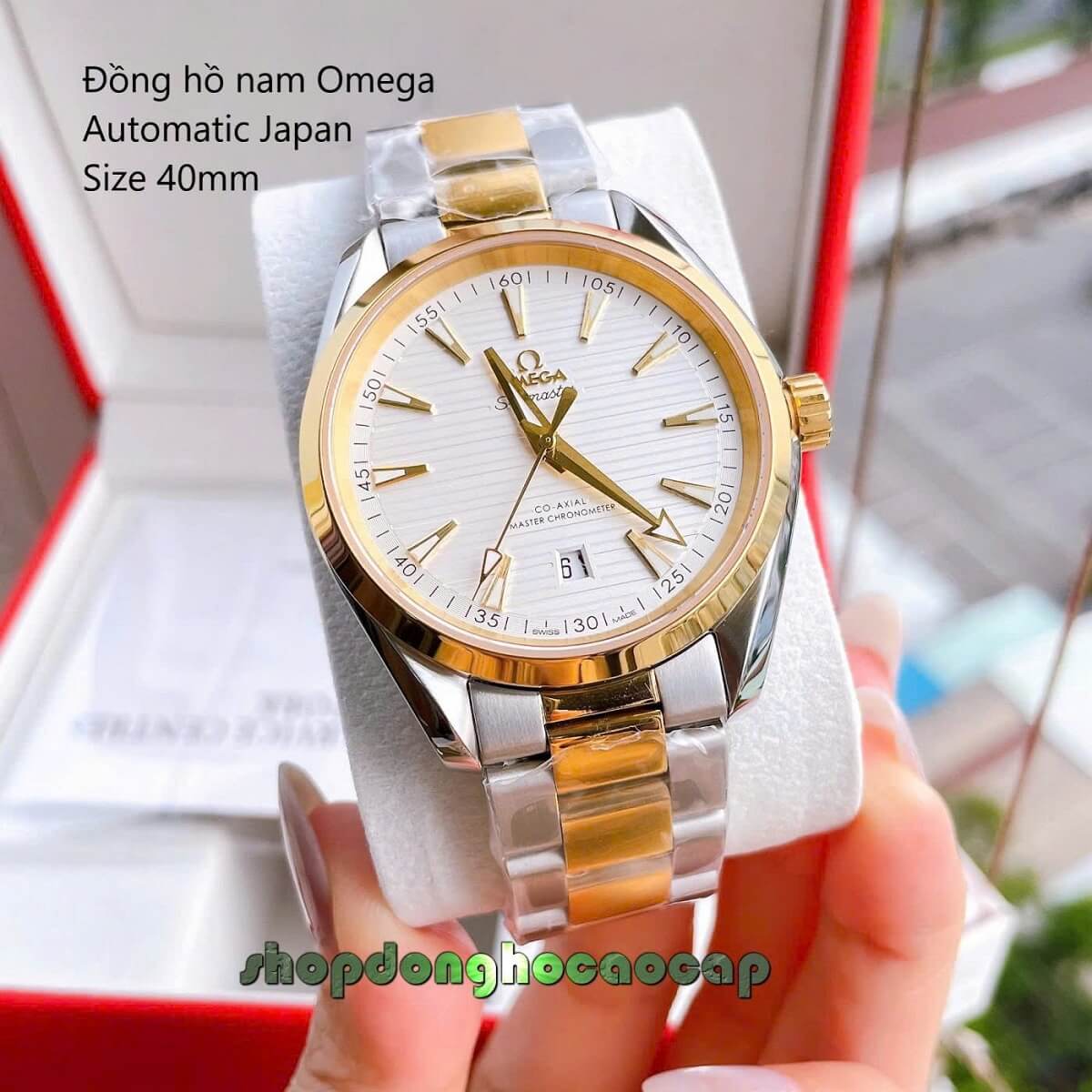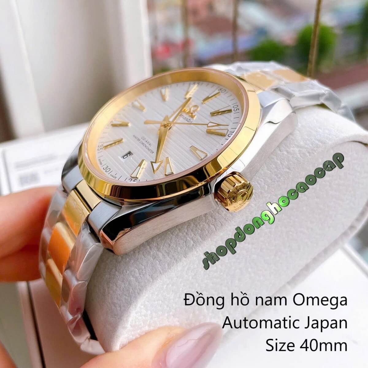 Đồng Hồ Nam Omega Máy Tự Động Nhật 1 Lịch Mặt Trắng Kim Loại Demi Vàng Sapphire Size 40mmm