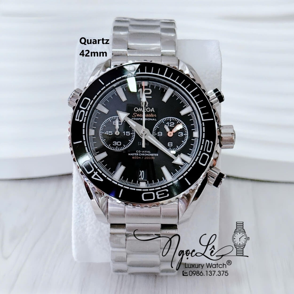 Hình ảnh Đồng Hồ Nam Omega Quartz Dây Kim Loại 5 Kim - Màu Bạc Mặt Đen Size 42mm